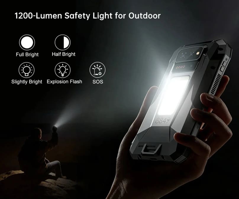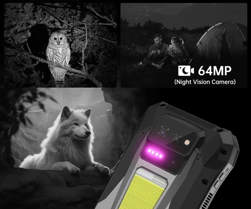 En la parte trasera se integra una luz de camping LED con un brillo máximo de 1.200 lúmenes, pensada para iluminación en entornos nocturnos o situaciones de emergencia. A esto se suma una cámara de visión nocturna de 64 MP, acompañada por cuatro LEDs infrarrojos, capaz de capturar imágenes incluso en oscuridad total, un elemento poco habitual fuera del nicho rugerizado.