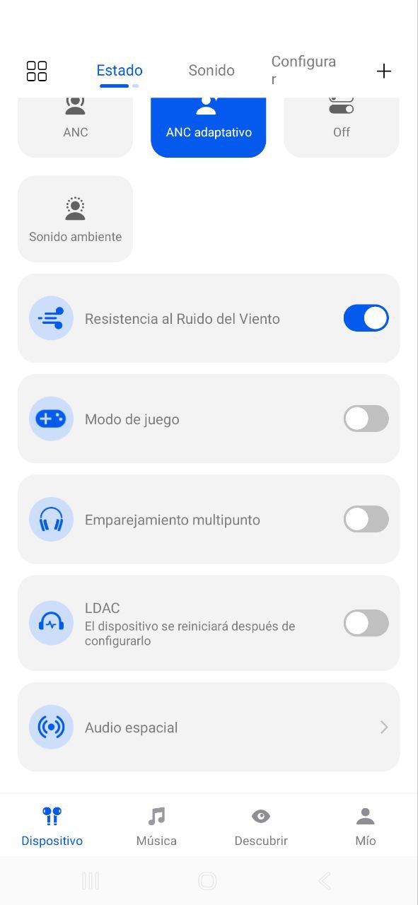 La compatibilidad con LDAC permite alcanzar tasas de hasta 990 kbps y 96 kHz/24 bits, lo que se traduce en una experiencia de alta fidelidad en dispositivos Android compatibles. Cabe destacar que LDAC y el audio espacial no pueden activarse simultáneamente, lo que nos obliga a priorizar entre resolución o inmersión.