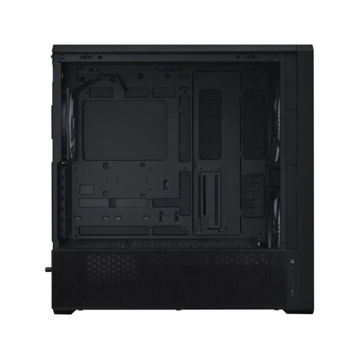 El chasis incluye tres ventiladores ARGB con hub central de espejo infinito, capaces de combinar alto flujo de aire con efectos luminosos envolventes. Los usuarios pueden controlar la iluminación mediante los botones M1 y M2 situados junto al botón de encendido, o bien vincular el sistema de forma inalámbrica a L-Connect 3 gracias al receptor interno integrado.