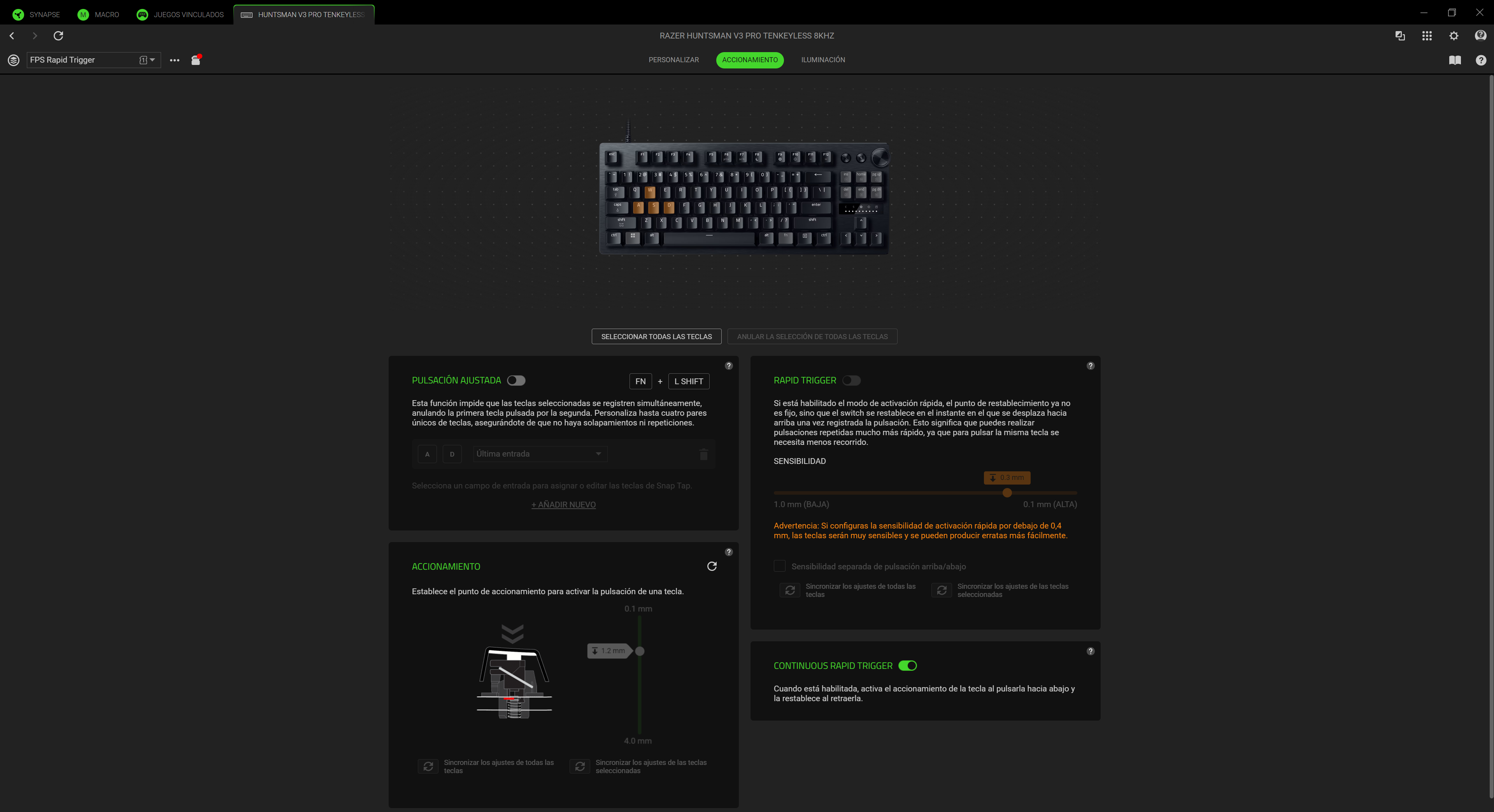Pero lo revolucionario es el rango de actuación ajustable de 0,1 a 4,0 mm. El modo Rapid Trigger es otro cantar. En vez de tener un punto de reset fijo, la tecla se resetea al instante. Esto permite pulsaciones repetidas ultrarrápidas. En juegos se siente mucho más natural y responsivo. La función Razer Snap Tap prioriza la última pulsación. Esto es brutal para cambios de dirección instantáneos. Puedes guardar hasta 4 pares de teclas para Snap Tap. La fuerza de actuación de 40 gramos es ligera, perfecta para pulsaciones rápidas sin fatiga. Los switches tienen una vida útil de 100 millones de pulsaciones.