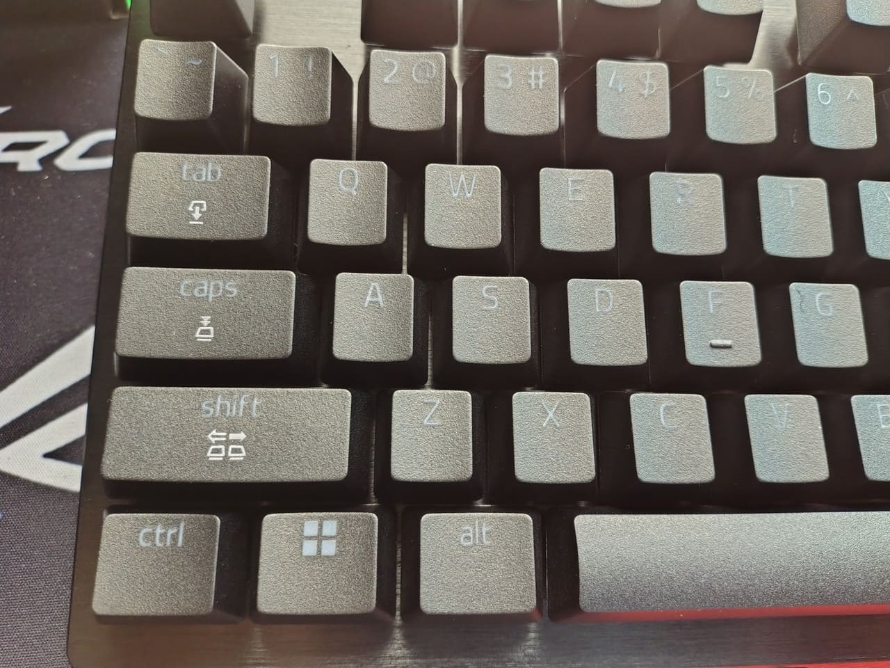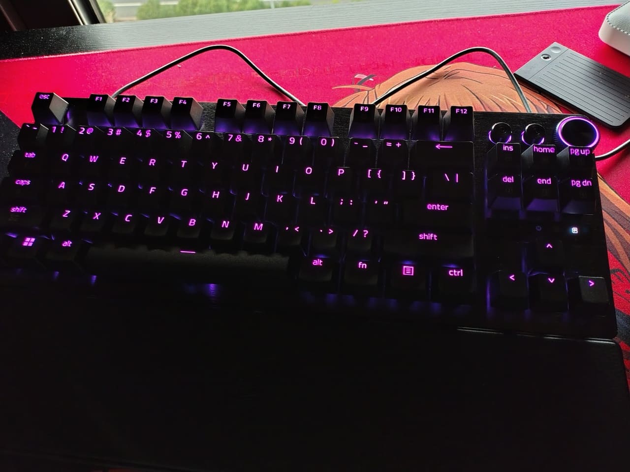 Aquí está el resultado de este teclado. Los switches ópticos analógicos Razer de segunda generación son una auténtica maravilla. A diferencia de los switches mecánicos tradicionales, estos utilizan luz infrarroja para detectar la pulsación. Lo primero que notas es la velocidad de respuesta. Con una tasa de sondeo de 8000 Hz real, la latencia de entrada es de apenas 0,58 milisegundos. En la práctica, la diferencia se siente especialmente en shooters competitivos donde cada milisegundo cuenta.