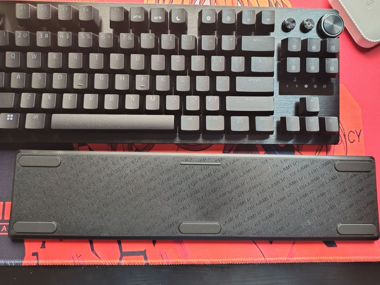El reposamuñecas magnético es un accesorio clave en este setup. Está fabricado en polipiel con relleno firme, no es acolchado tipo memoria como otros modelos porque busca oitro obnjetivo. Razer prioriza la velocidad y precisión sobre la comodidad extrema. El acabado imita piel de serpiente con el logo de las tres serpientes grabado. El sistema magnético funciona de maravilla y se acopla con un satisfactorio «clic». Personalmente lo uso siempre porque reduce la fatiga en sesiones largas.