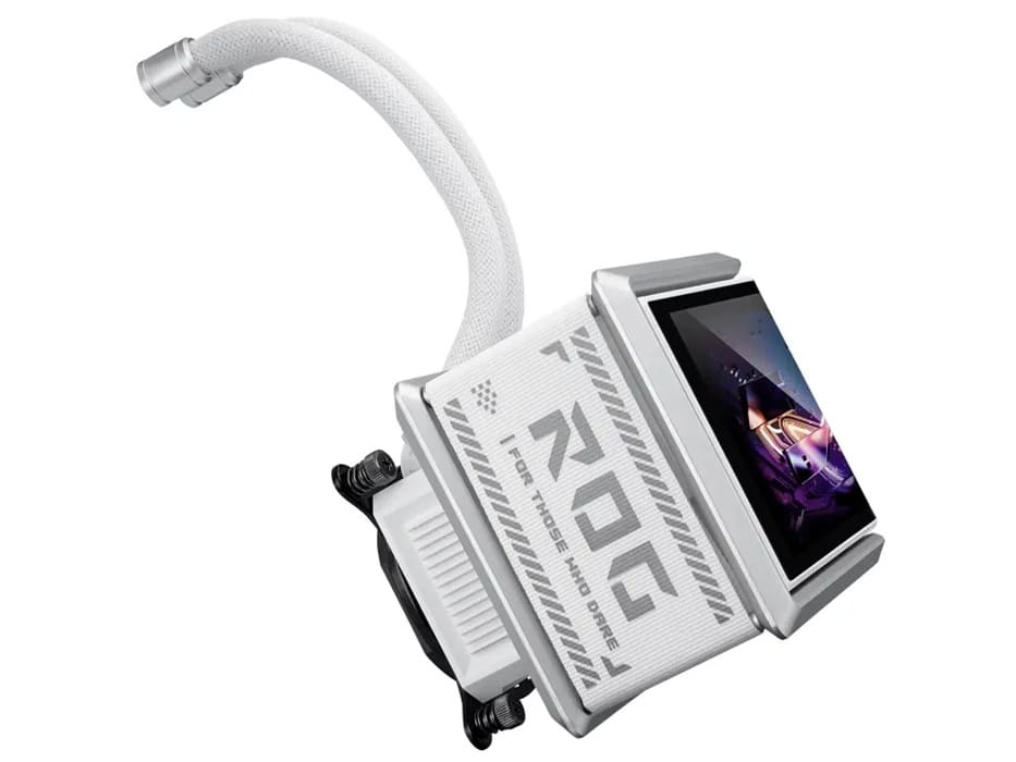 El Ryuo IV SLC 360 ARGB White Edition mantiene el radiador de 360 mm con tres ventiladores ARGB de 120 mm, conectados mediante el sistema daisy-chain de ASUS, que reduce el cableado visible y simplifica el montaje. En el bloque de la bomba destaca una pantalla AMOLED de 6,67 pulgadas, personalizable mediante Armoury Crate, donde se pueden mostrar temperaturas, carga del sistema o gráficos animados.