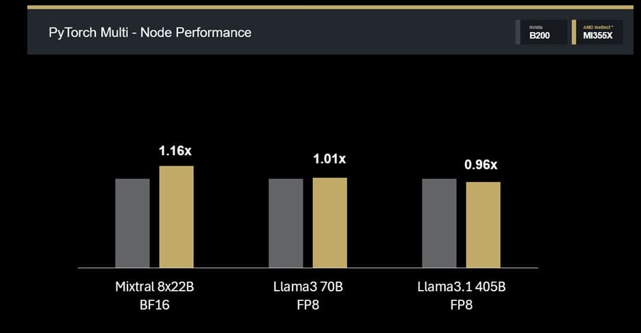 Estos datos demuestran que las GPU MI355X no solo destacan en rendimiento por nodo, sino que también escalan eficazmente para entrenamiento LLM a gran escala, manteniendo una relación rendimiento-consumo muy competitiva frente a NVIDIA.