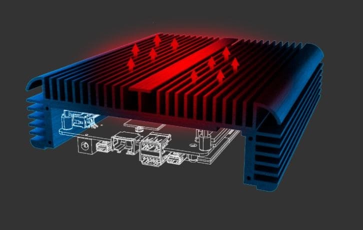 Al tratarse de un diseño fanless, la disipación térmica se basa en paneles ventilados y un gran módulo térmico de aluminio, encargado de transferir el calor del procesador hacia las aletas externas del chasis. Este enfoque permite mantener un rendimiento estable durante largas sesiones sin necesidad de ventilación activa, algo especialmente valorado en entornos profesionales silenciosos.