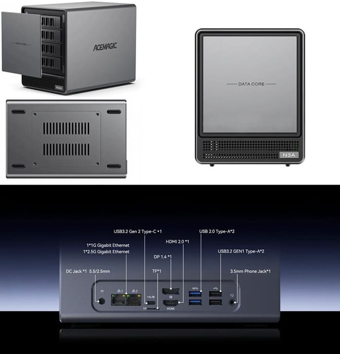 A nivel de conectividad, el Acemagic N3A ofrece una configuración bastante completa para su tamaño. Incluye puertos como USB 3.2 Gen 2 Type-C, múltiples USB-A, doble red con 2.5G Ethernet y 1G Ethernet, así como salidas de vídeo DisplayPort 1.4 y HDMI 2.0, lo que amplía sus posibilidades de uso más allá del almacenamiento.