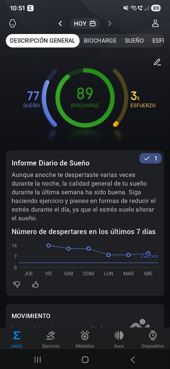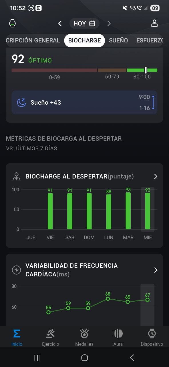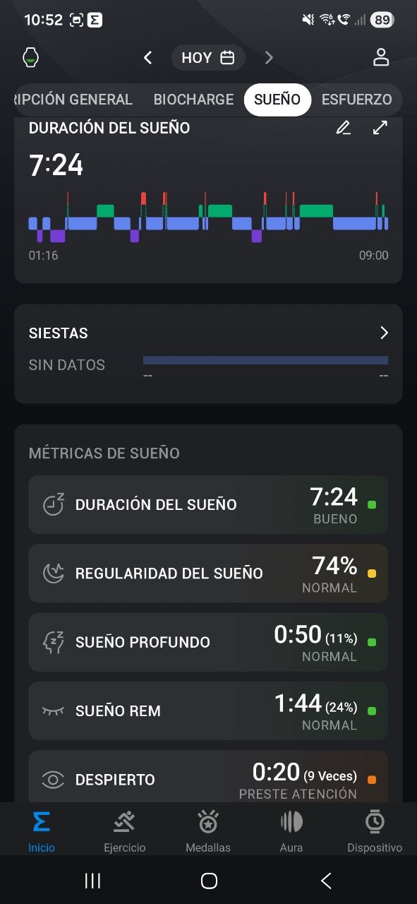 El seguimiento del descanso y el sueño es minucioso y detallado, desglosando las noches en fases de sueño ligero, profundo y REM, e incluso evaluando la calidad de la respiración nocturna para detectar posibles apneas. El sistema operativo cruza todos estos datos de recuperación fisiológica con el historial de estrés y carga física para ofrecer una métrica de «Preparación» o «Readiness» cada mañana, indicando de forma clara mediante una puntuación si el cuerpo del usuario está listo para afrontar un entrenamiento extenuante o si, por el contrario, requiere descanso activo para evitar lesiones o sobreentrenamiento.