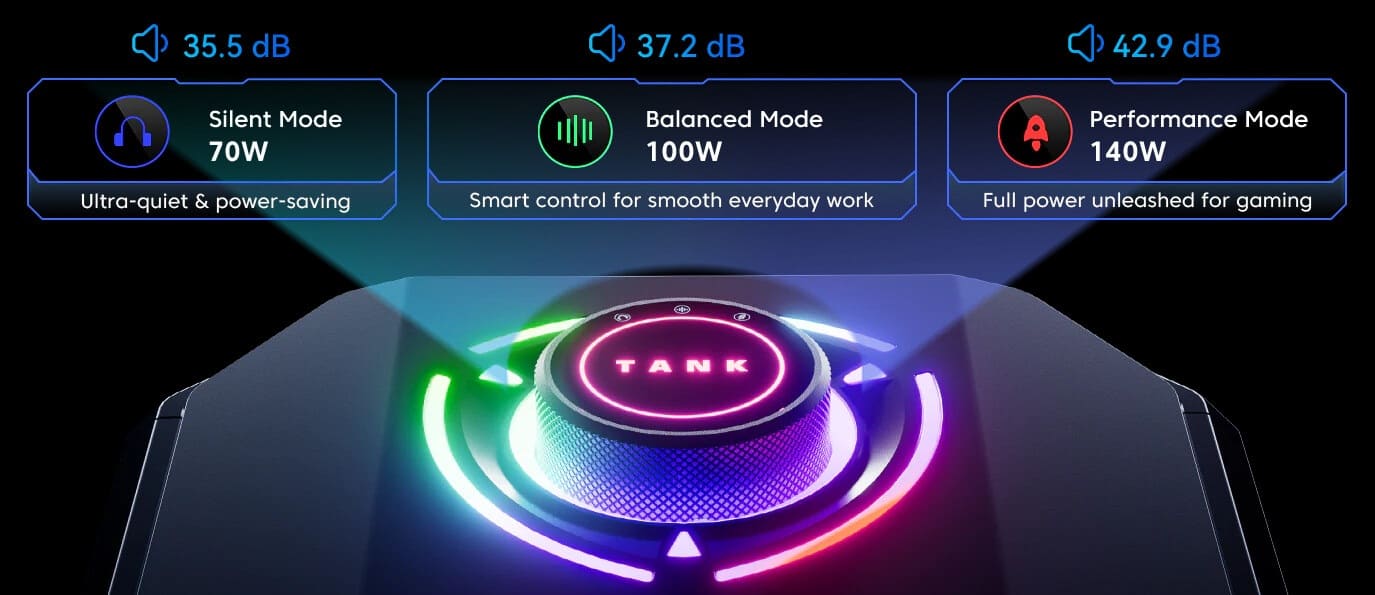 Uno de sus elementos más distintivos fue el dial físico de rendimiento, con modos Silent, Auto y Performance, que permitía ajustar de forma inmediata el equilibrio entre ruido, consumo y potencia. Esa identidad se mantiene intacta en la nueva familia Tank Centre.
