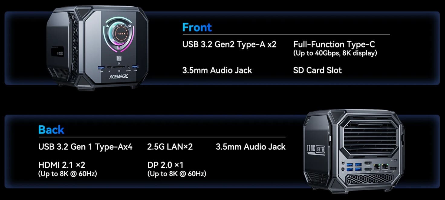 Visualmente, la serie Tank Centre conserva la estética industrial del TANK 03, junto con iluminación RGB configurable y el ya conocido selector físico de modos de rendimiento. Internamente, ACEMAGIC ha introducido una solución térmica revisada, con ventiladores de gran diámetro y múltiples heatpipes, pensada para mantener frecuencias estables bajo cargas prolongadas.