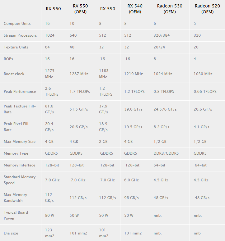 La hermana pequeña la RX 520, está dispone de 320cores con 5CUs y también dispondrá de una versión de 1GB y 2GB de memoria GDDR5, con un procesador basado en 28nm con 0.66TFLOPs.