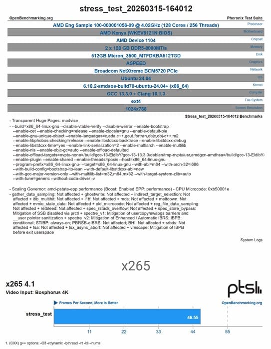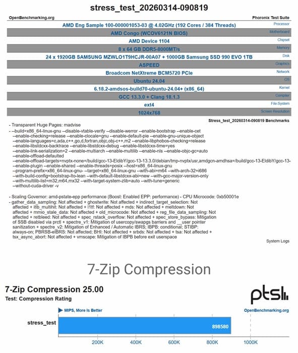 Entre las configuraciones más destacadas aparece una muestra de ingeniería con 192 núcleos y 384 hilos funcionando a 4,02 GHz, acompañada de memoria DDR5 en configuración de 8 módulos de 64 GB a 8.000 MT/s, lo que evidencia un enfoque claro hacia cargas de trabajo altamente paralelizables en entornos profesionales y centros de datos de gran escala.