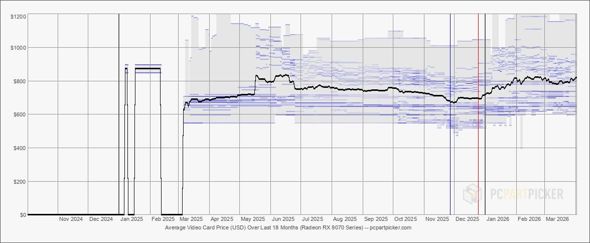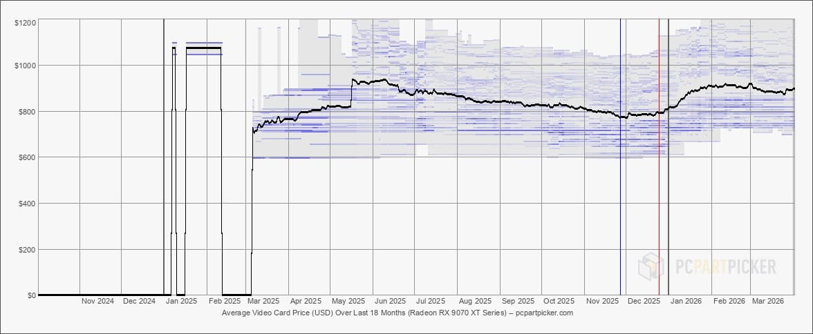 Mientras Europa empieza a estabilizarse, Estados Unidos sigue atrapado en una dinámica completamente distinta. Allí, la RX 9070 se mueve entre 810$ y 820$, mientras que la RX 9070 XT alcanza los 880$ y 890$, cifras muy alejadas de sus precios oficiales.