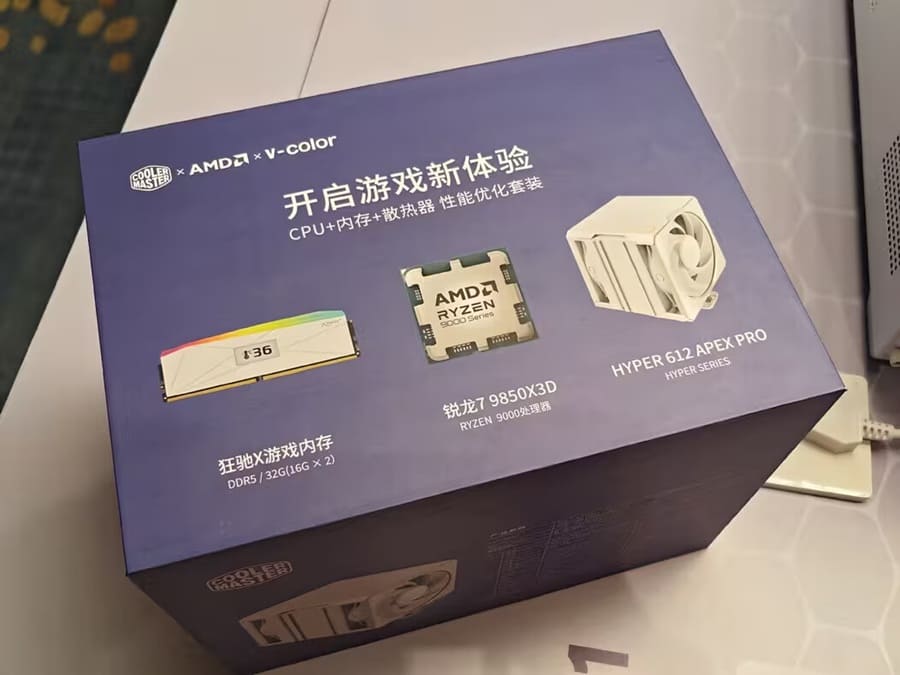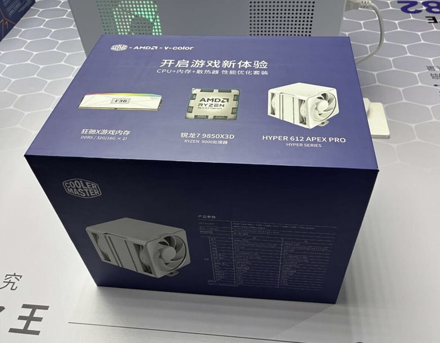 Las primeras imágenes de este pack proceden del blog de JoyBuy en Bilibili, donde se muestra una caja retail que apunta a una edición regional exclusiva. El conjunto incluye el Ryzen 7 9850X3D, memoria V-Color Manta XFinity+ OLED DDR5 y un Cooler Master HYPER 612 APEX Pro en acabado blanco. Todo indica que este paquete fue presentado durante un evento reciente de Cooler Master en China, fruto de una colaboración puntual entre las marcas.