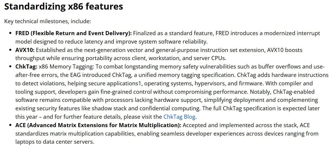 Otro avance importante es ChkTag x86 Memory Tagging, una función orientada a la seguridad de la memoria que ayuda a prevenir vulnerabilidades asociadas a desbordamientos de búfer y errores use-after-free. Esta característica asigna etiquetas de control a regiones de memoria, verificando accesos ilegales y mitigando posibles ataques de corrupción de datos en tiempo de ejecución.