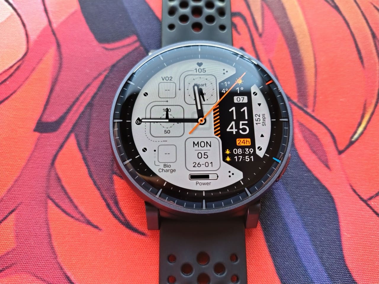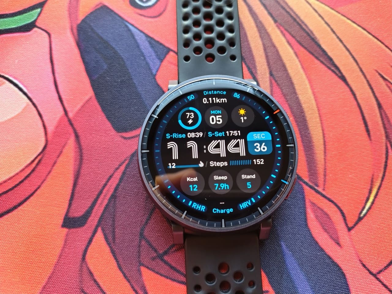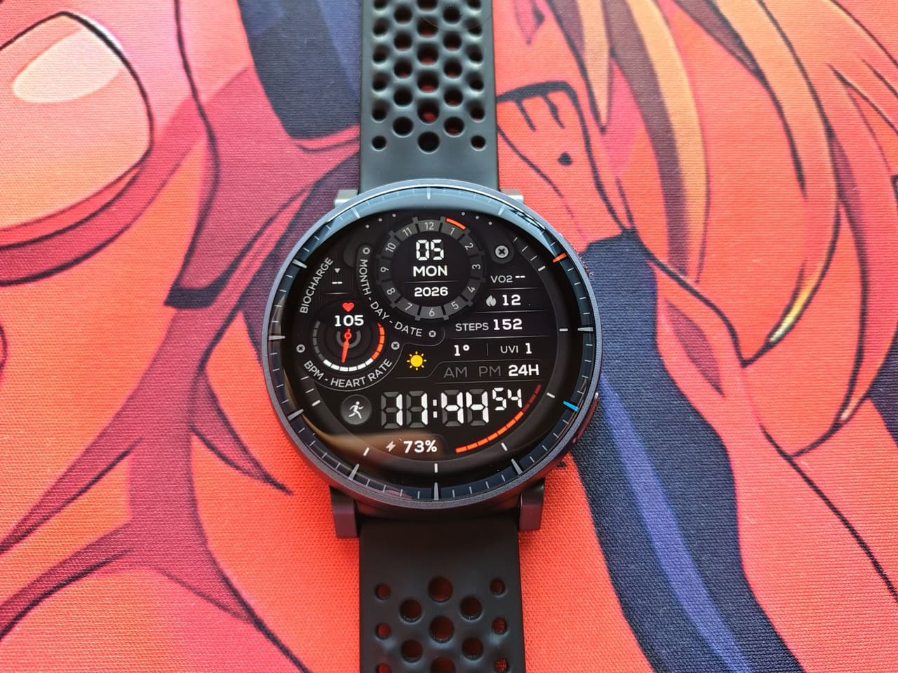 Aquí es donde Amazfit ha revoluciona con la pantalla AMOLED de 1,5 pulgadas. Es una bestia: 3000 nits de brillo máximo. Para que os hagáis una idea, esto es el mismo brillo que el T-Rex 3 Pro, un reloj que cuesta más del doble. La resolución de 480×480 píxeles (322 ppi) es nítida, los colores son vivos y el contraste AMOLED se siente en cada métrica.