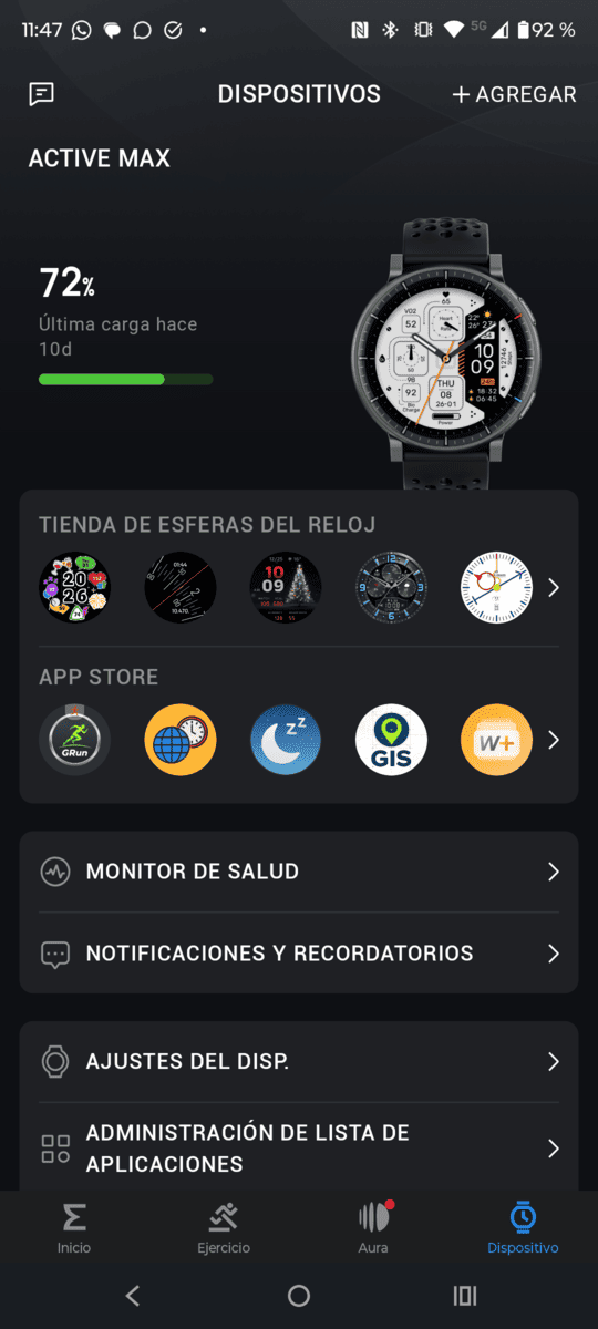 Zepp OS 5 es fluido en el Active Max, algo que me encanta de la marca ya que otros relojes con muchas funciones de otras marcas tienen un software que se arrastra. Las llamadas Bluetooth van bien para conversaciones cortas, el altavoz tiene volumen suficiente incluso en exterior, y el dictado de voz (Android por ahora) funciona correctamente y me ha sacado de algún apuro para contestar mensajes.
