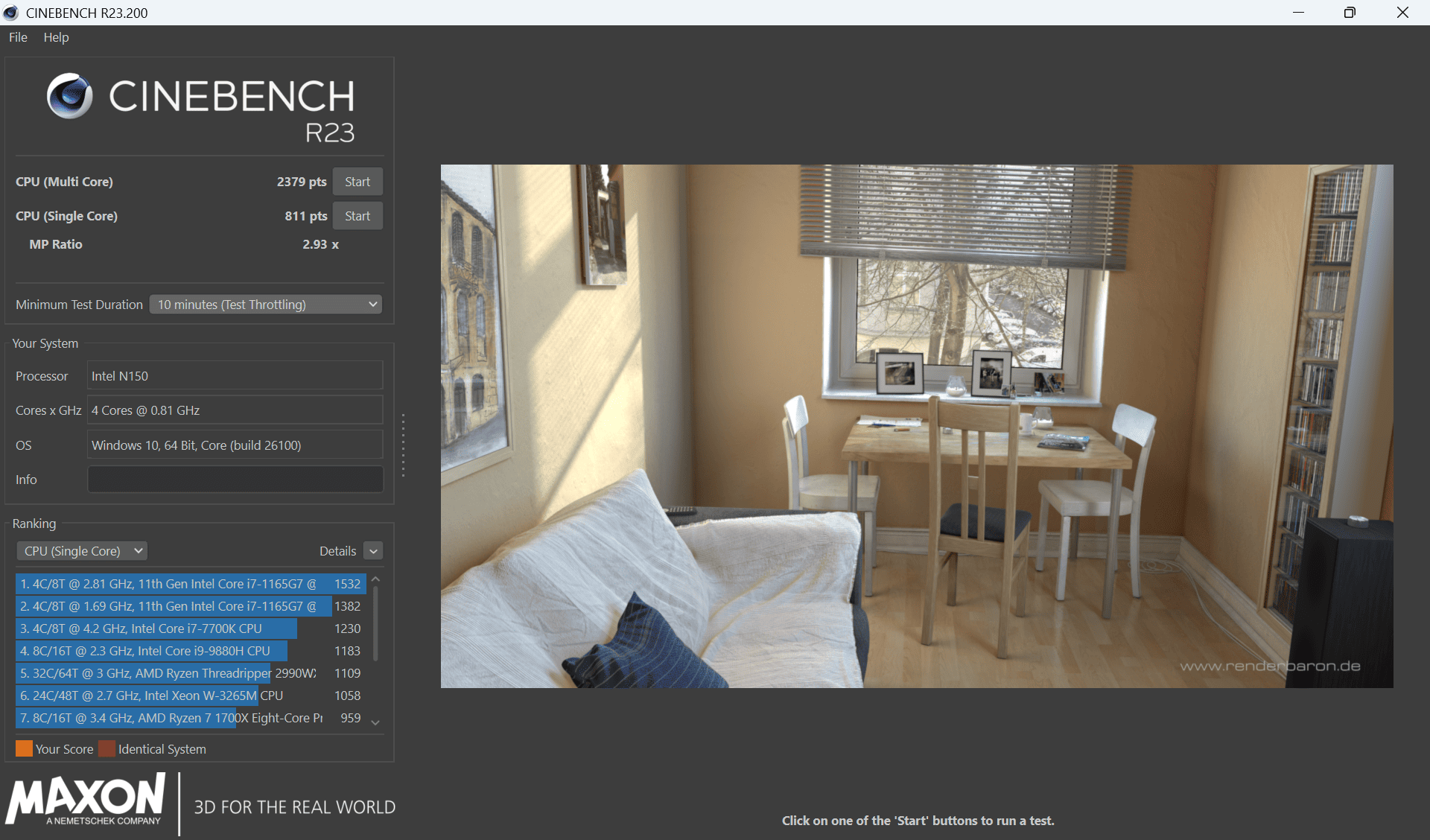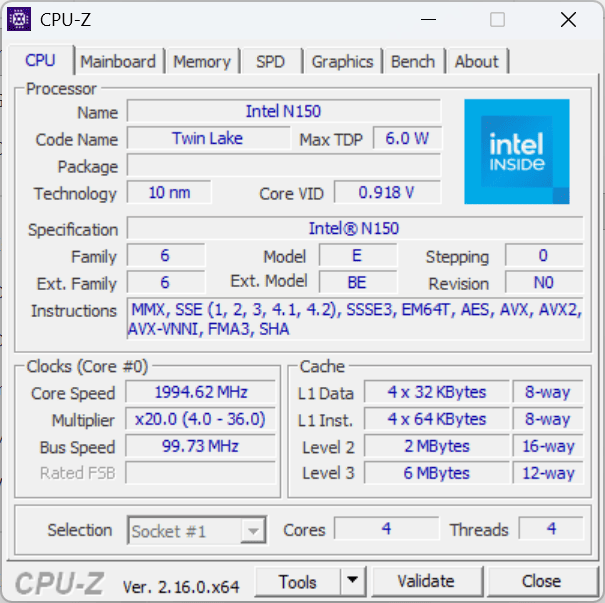 Y llegamos al núcleo de este equipo donde vemos la diferencia con el modelo original. El MiniBook X N150 cambia el Intel Alder-N N100 por el Intel Twin Lake N150. Se trata de un procesador de bajo consumo que puede alcanzar una frecuencia turbo de 3,6 GHz contando con 4 núcleos y 4 hilos, 200 MHz más que su predecesor.