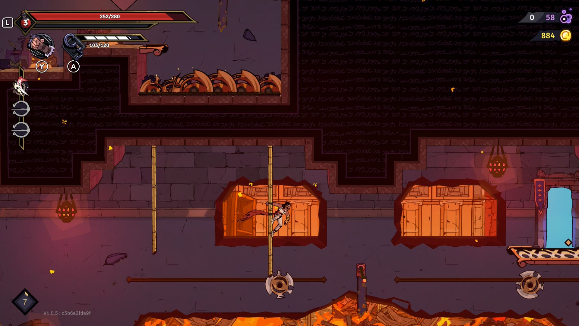 No tanto porque sea siempre la opción más óptima (que tiene recompensa), sino por el puro placer que ofrece al mando combinar cada movimiento. Hay una satisfacción casi física en cómo el personaje responde a cada orden, y eso se convierte en el principal motor del juego. El resto de elementos que justifican su etiqueta de roguelike están ahí, y luego hablaremos un poco de ellos, pero resultan menos interesantes porque ya los hemos visto decenas de veces. Si este bucle termina atrapándote no es por sus sistemas, sino por la forma en la que todo responde a tus acciones: las sutilezas de los saltos, los agarres en los postes, los ataques cargados o la manera en la que enlazas el parkour con rebotes y volteretas hasta lograr una secuencia sin interrupciones.