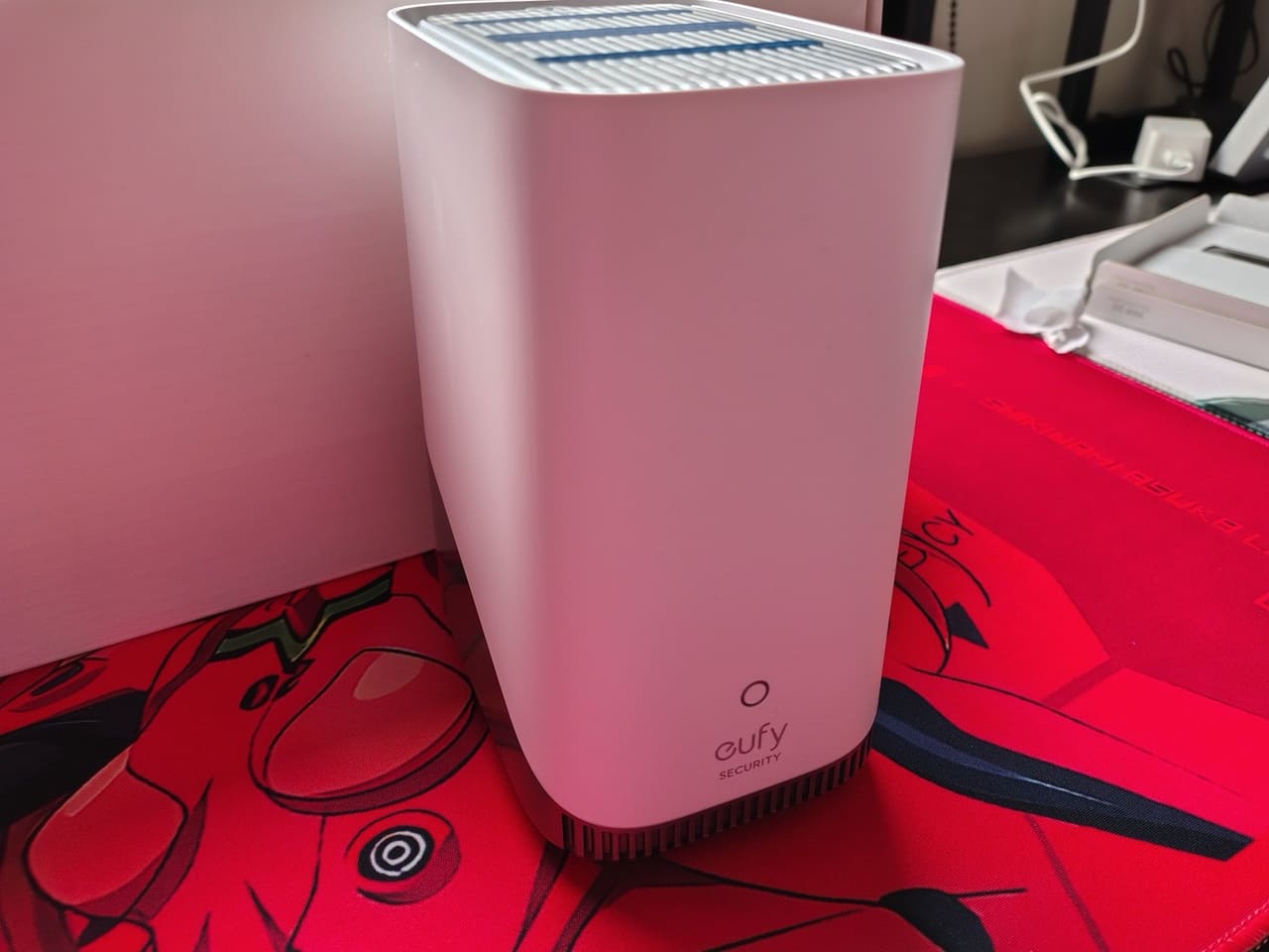 La HomeBase S380 es compacta: un cubo de aluminio gris antracita de 12x12x3 centímetros, cuyo frente muestra un LED indicador RGB que parpadea verde cuando está en línea. El puerto USB para cargar cámaras está en la parte frontal (muy práctico), el conector Ethernet en trasera.