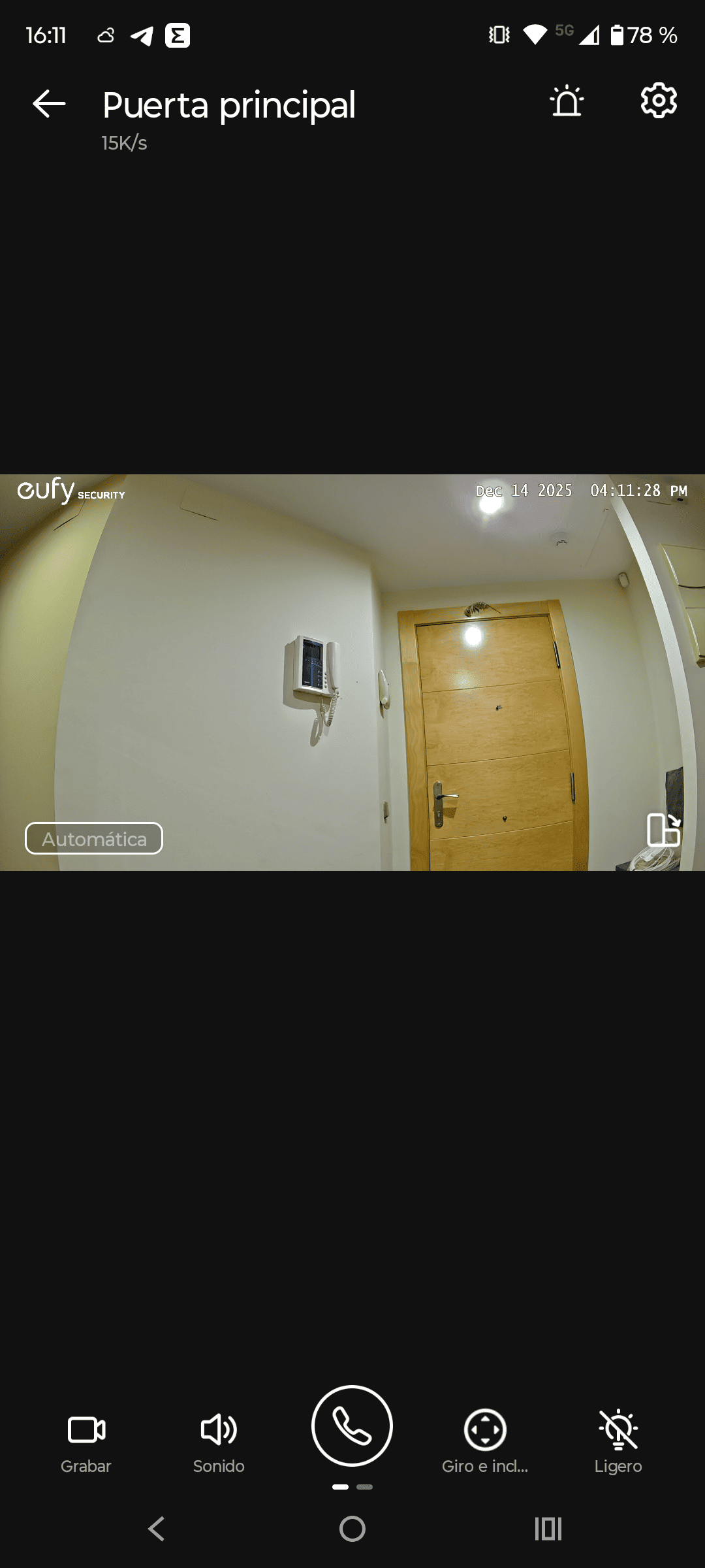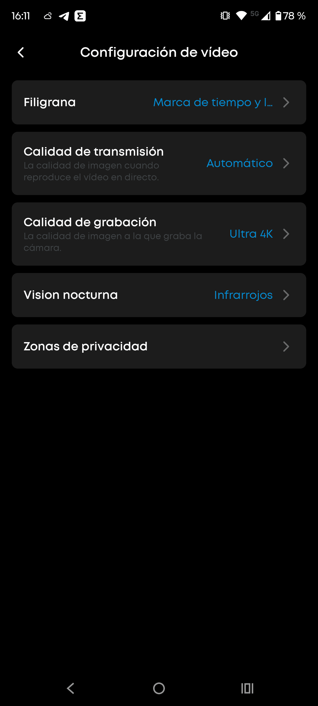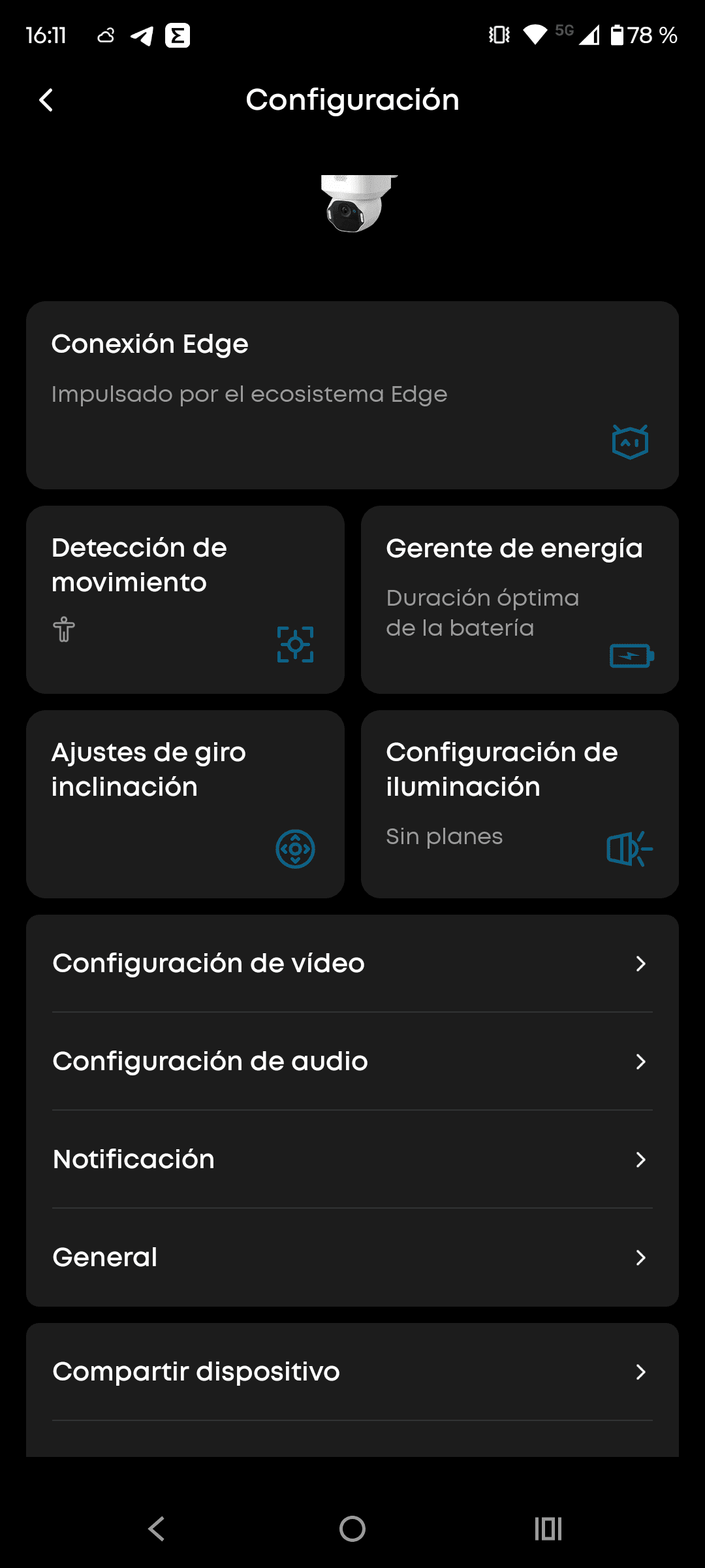 El foco LED de 600 lúmenes integrado entra en acción al atardecer. Cuando detecta movimiento se enciende automáticamente con secuencia temporal configurable (puedes ajustar entre 3 y 30 segundos de duración). La iluminación es blanca neutra y cubre el área a una distancia de hasta 8 metros con claridad visible. Por otro lado, en cuanto a la grabación de vídeo nocturno con foco está en color, no en blanco y negro como con infrarrojo.