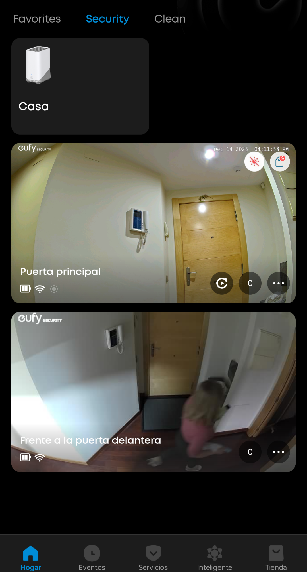 La aplicación muestra todo en línea de tiempo de eventos ordenado por día. Cada evento detectado está etiquetado. Además, me gusta puedes ver video captado, confirmar o falsa alarma. La IA aprende de tus correcciones.