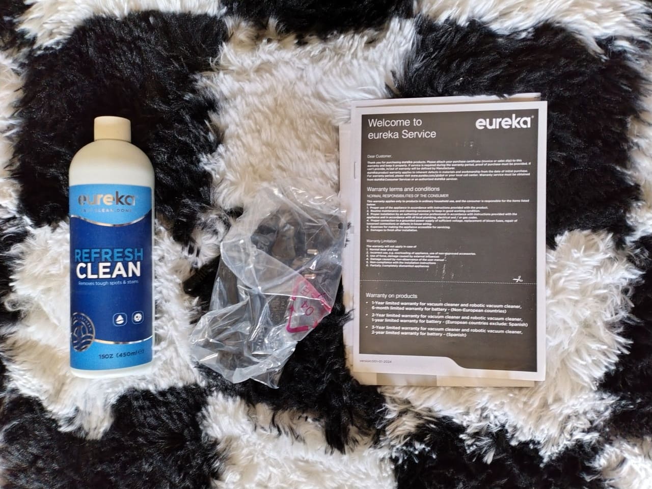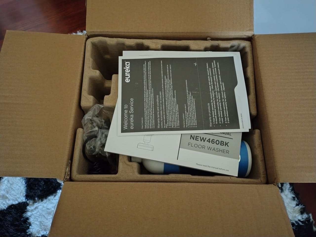 Cuando saco el dispositivo de la caja, veo que en la caja del Eureka FloorShine 460 se incluyen el cuerpo principal, el asa, la base de carga o soporte, el tanque de agua limpia, el tanque de agua sucia, un rulo de limpieza, el filtro, el adaptador de corriente, un pequeño bote de detergente y el manual de usuario. Es el típico pack completo para poder empezar a limpiar nada más montarlo, sin accesorios extraños ni boquillas específicas para zonas muy concretas.