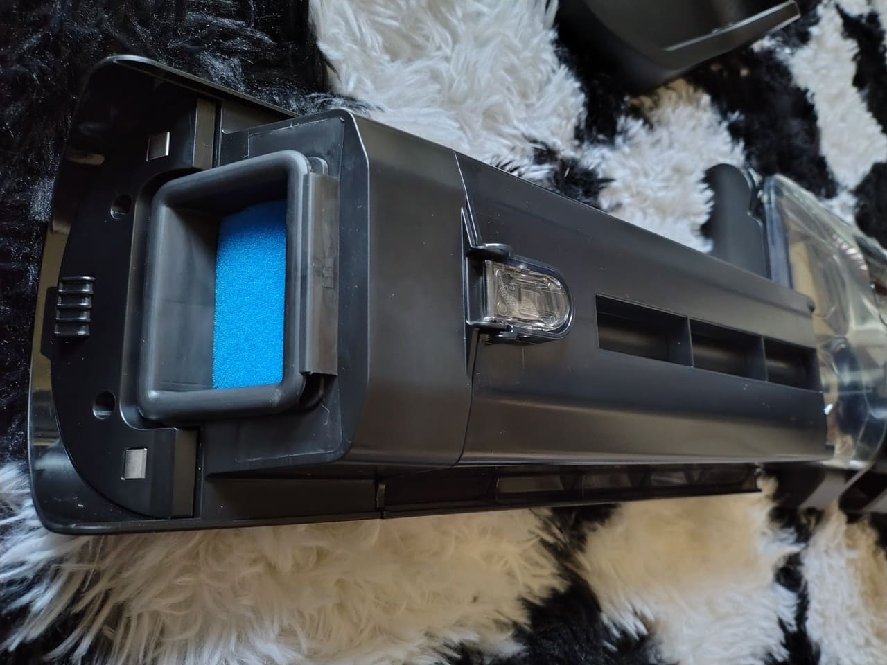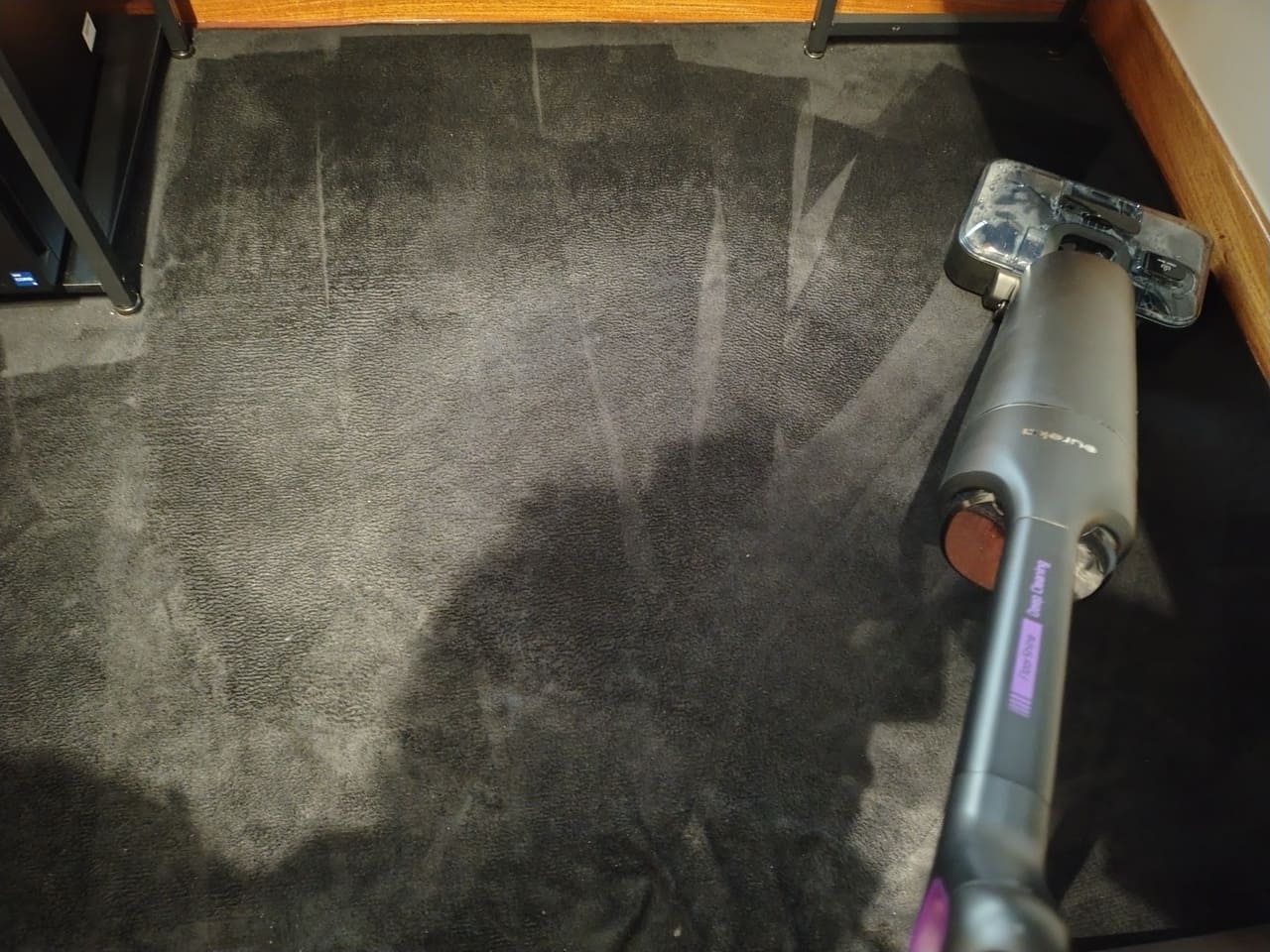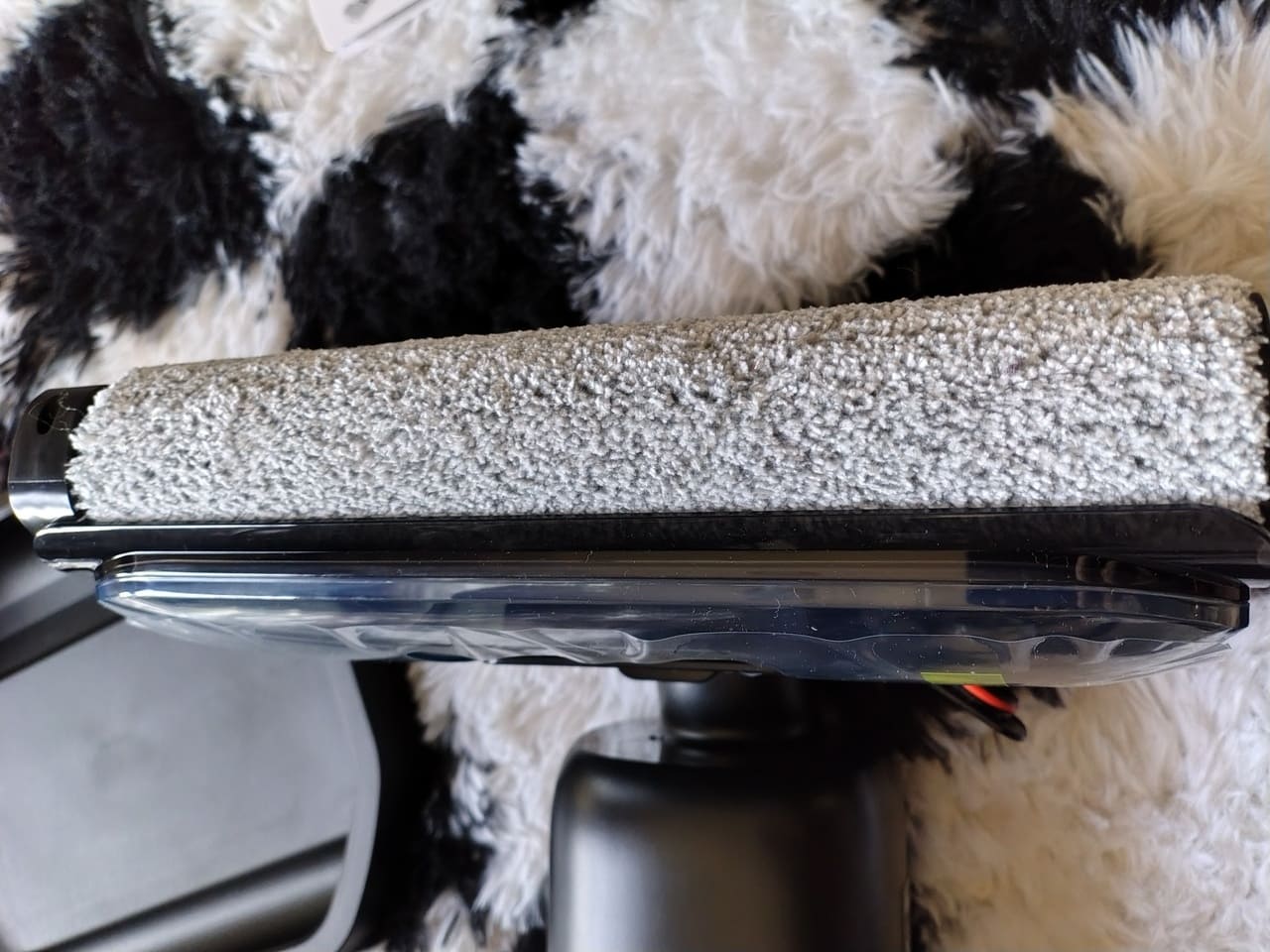 Algo interesante que me ha gustado es que el equipo entra en modo pausa cuando se coloca en posición vertical o semi-vertical, de manera que se puede detener el rulo y la pulverización si se quiere contestar al timbre o recolocar un mueble sin apagarlo del todo. A nivel de sensación en mano, transmite la impresión de producto sólido, sin crujidos raros al forzar la inclinación y sin holguras perceptibles en las uniones del asa o los depósitos.