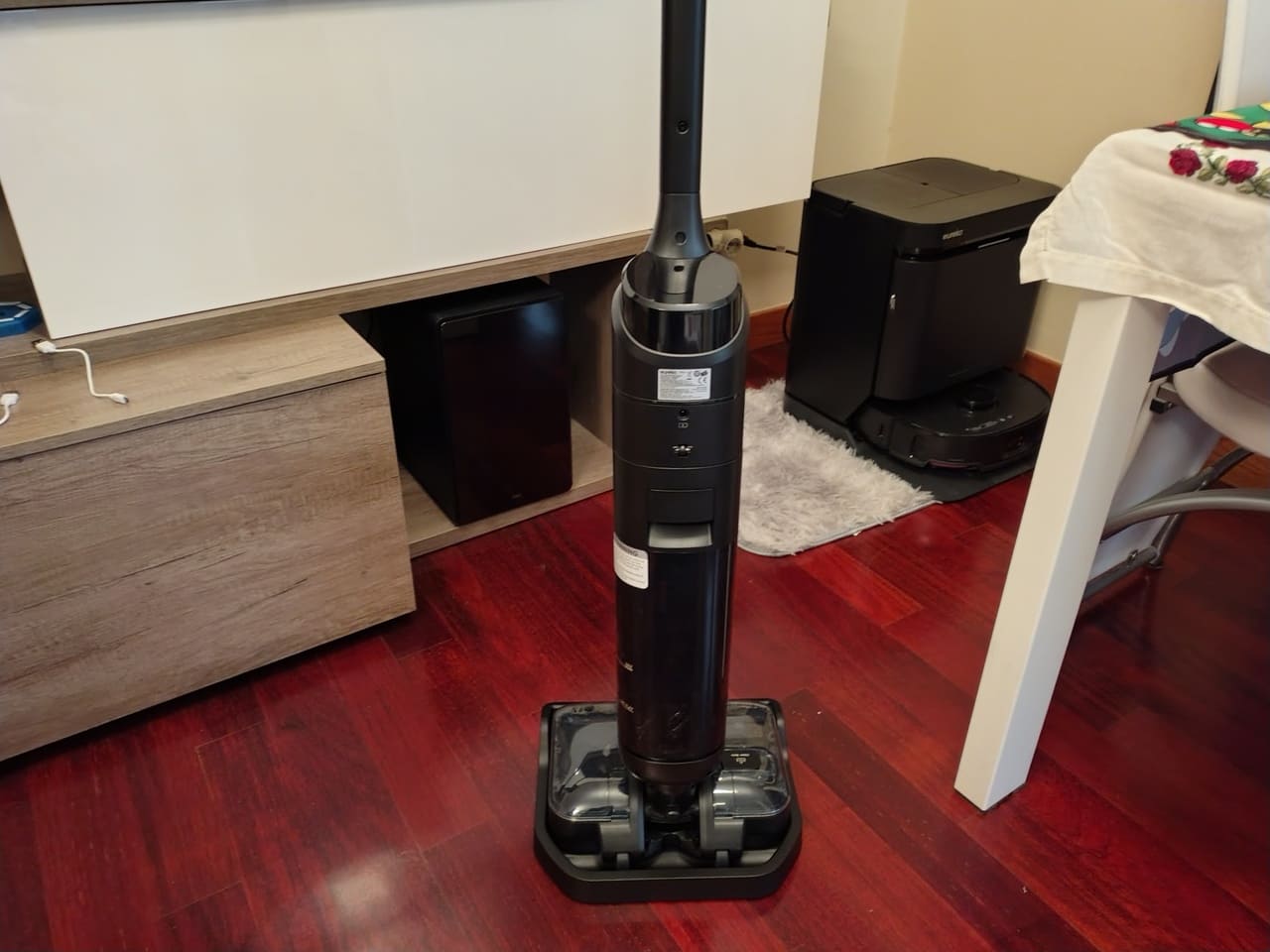 En cuanto al cuidado del equipo, el FloorShine 460 incorpora un ciclo de auto-limpieza desde la base que hace circular agua limpia por el rulo para eliminar restos de suciedad y detergente, seguido de un proceso de secado con aire caliente que ayuda a evitar malos olores y proliferación de bacterias. A esto se suma un sistema de anti-enredos con un pequeño peine interno que reduce la acumulación de pelos en el rodillo, algo muy de agradecer si hay mascotas en casa.