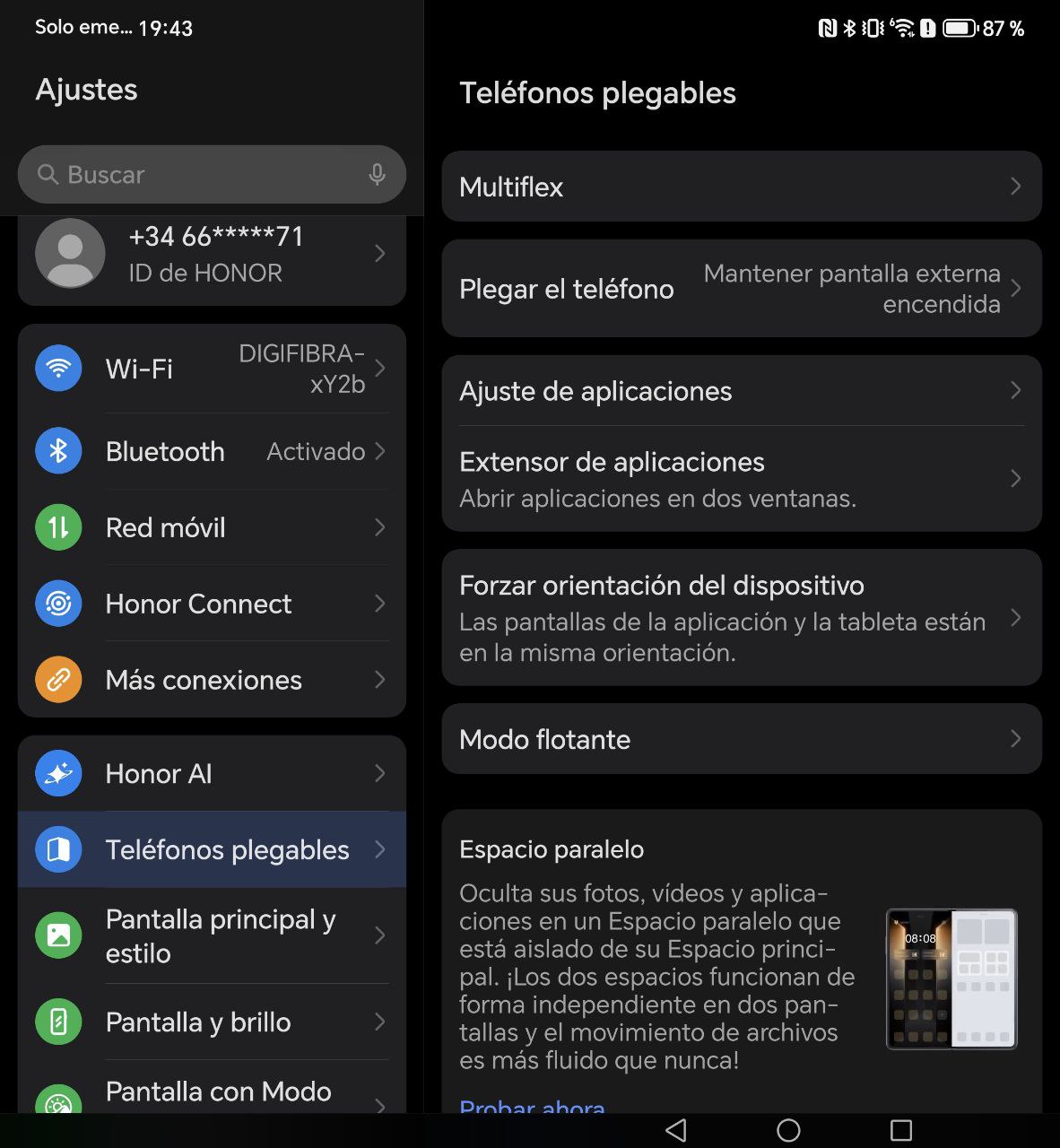 El HONOR Magic V5 llega con MagicOS 9 sobre Android 15, una capa que ha evolucionado para adaptarse al formato plegable. La multitarea es uno de sus puntos fuertes: permite dividir la pantalla en dos o tres aplicaciones, arrastrar y soltar contenido entre ellas y ajustar ventanas flotantes.