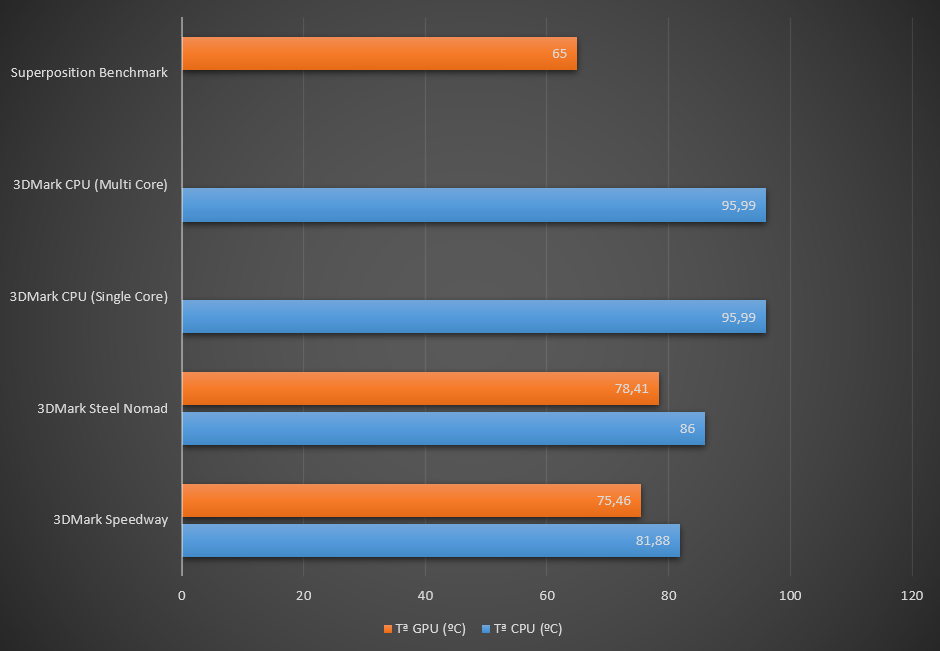Uno de los aspectos más relevantes en este modelo es su sistema de refrigeración. HP ha integrado una cámara de vapor y metal líquido, junto con ventiladores autolimpiantes. En cargas intensivas, el equipo mantiene temperaturas aceptables, aunque la CPU puede alcanzar valores elevados, lo que nos puede limitar si llegamos al thermal throttling que proteja el procesador de una sobre temperatura.