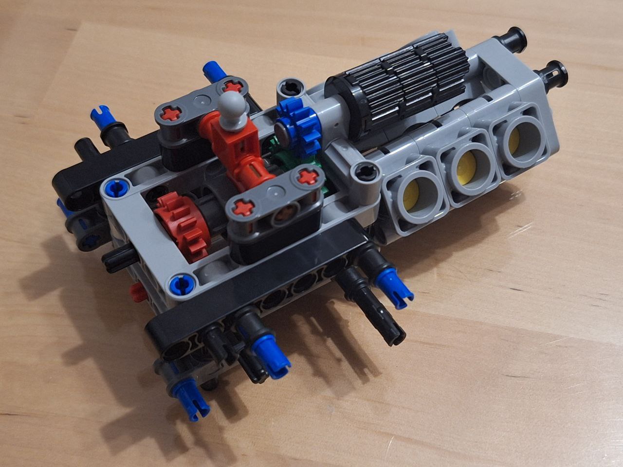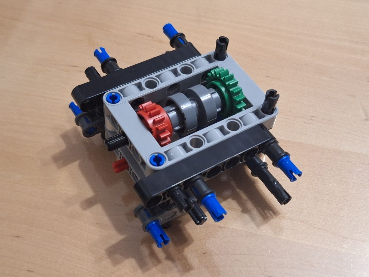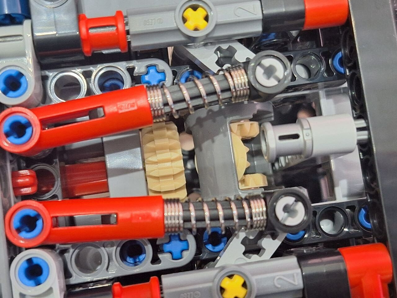 Aquí aparece uno de los elementos más técnicos del set: la caja de cambios funcional. El modelo incorpora dos velocidades más punto muerto, lo que en la práctica se traduce en tres posiciones mecánicas.