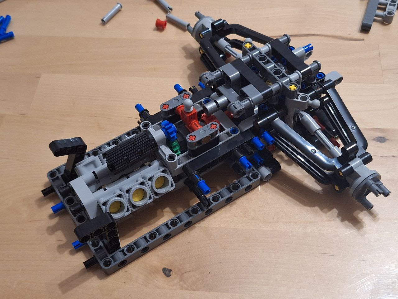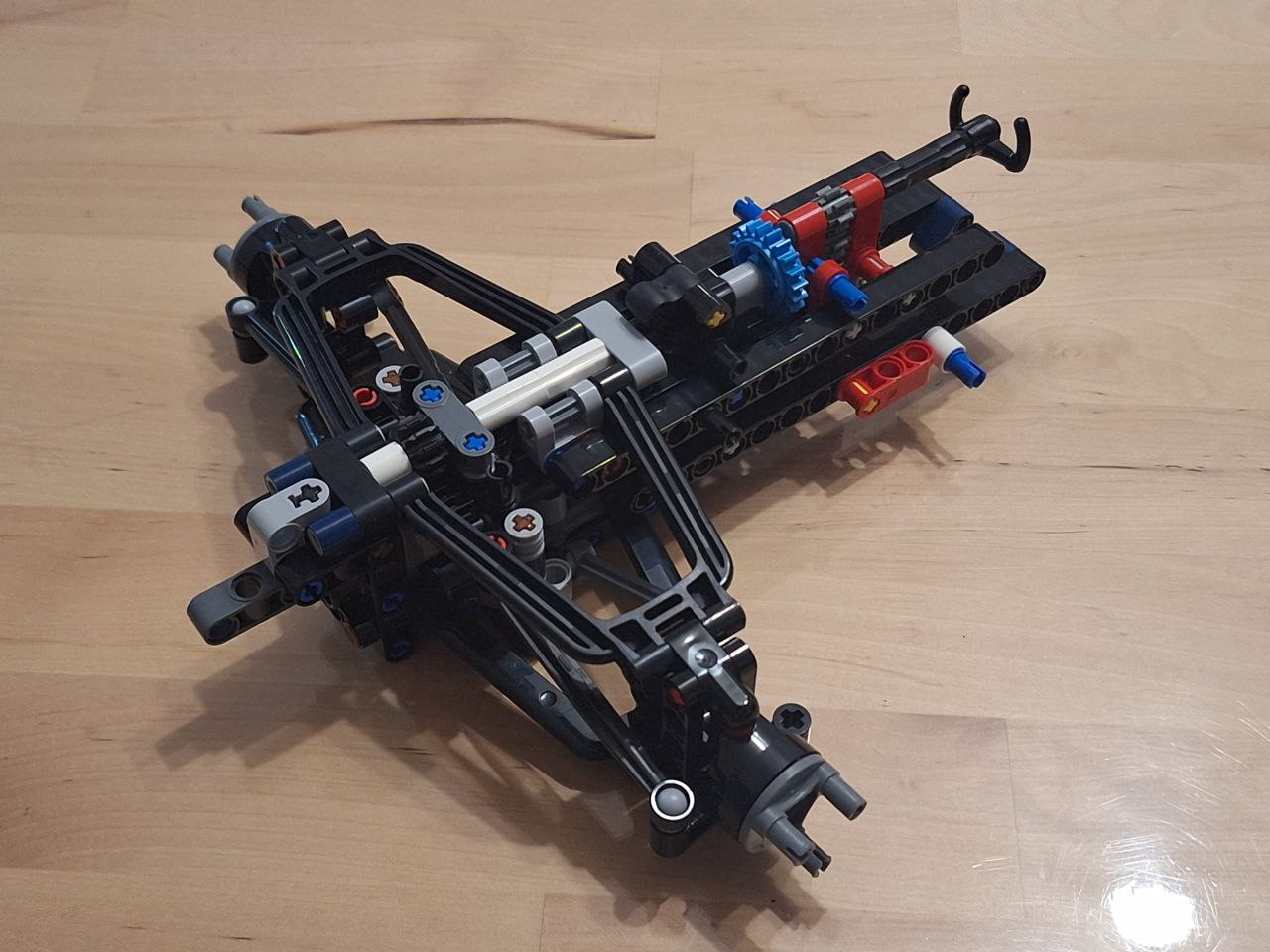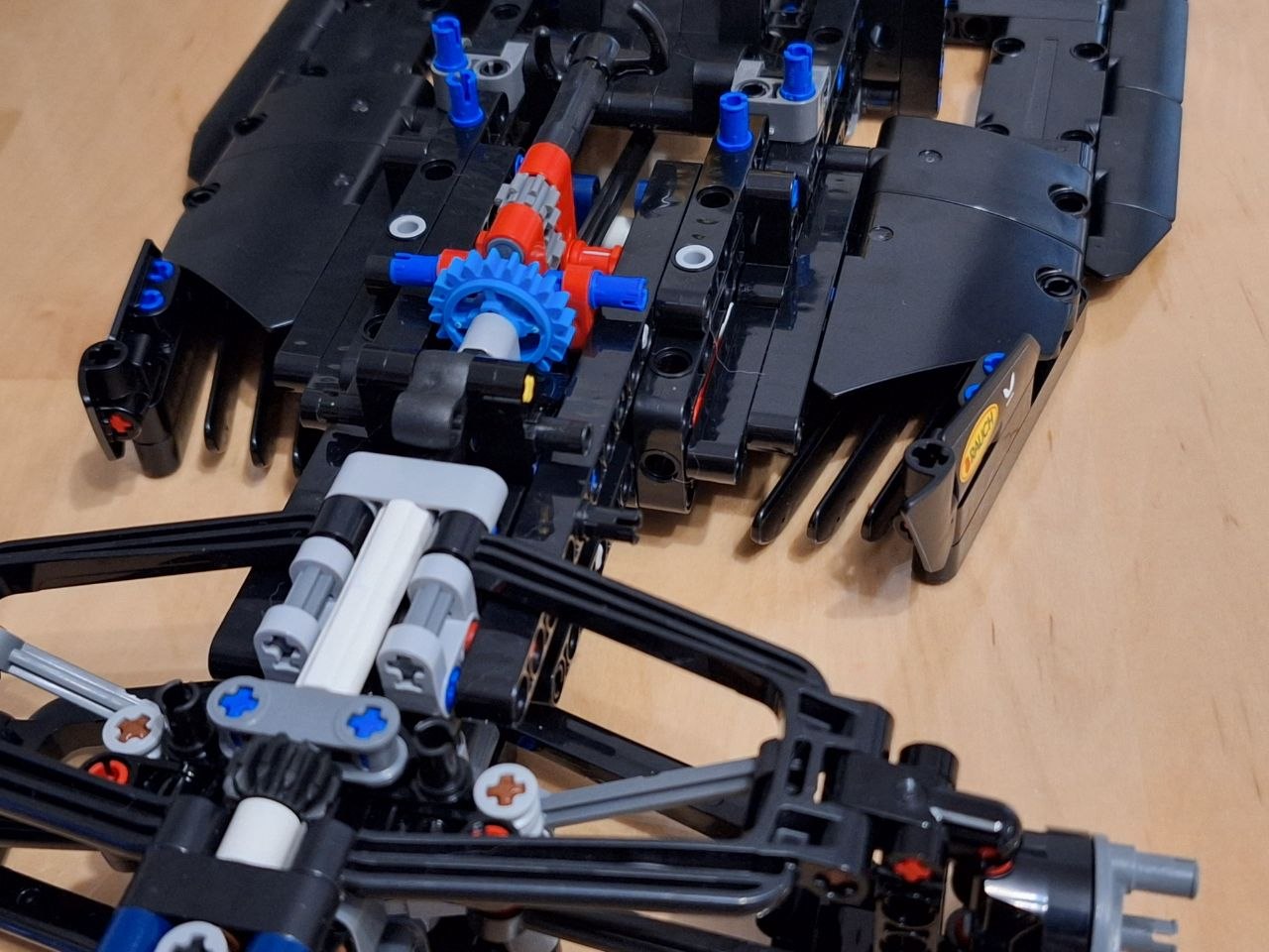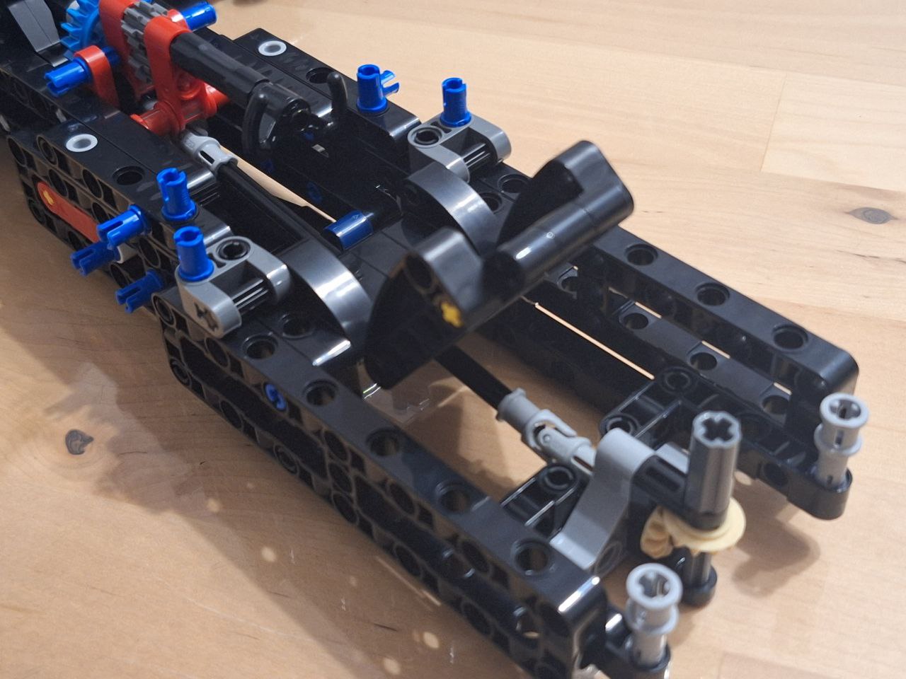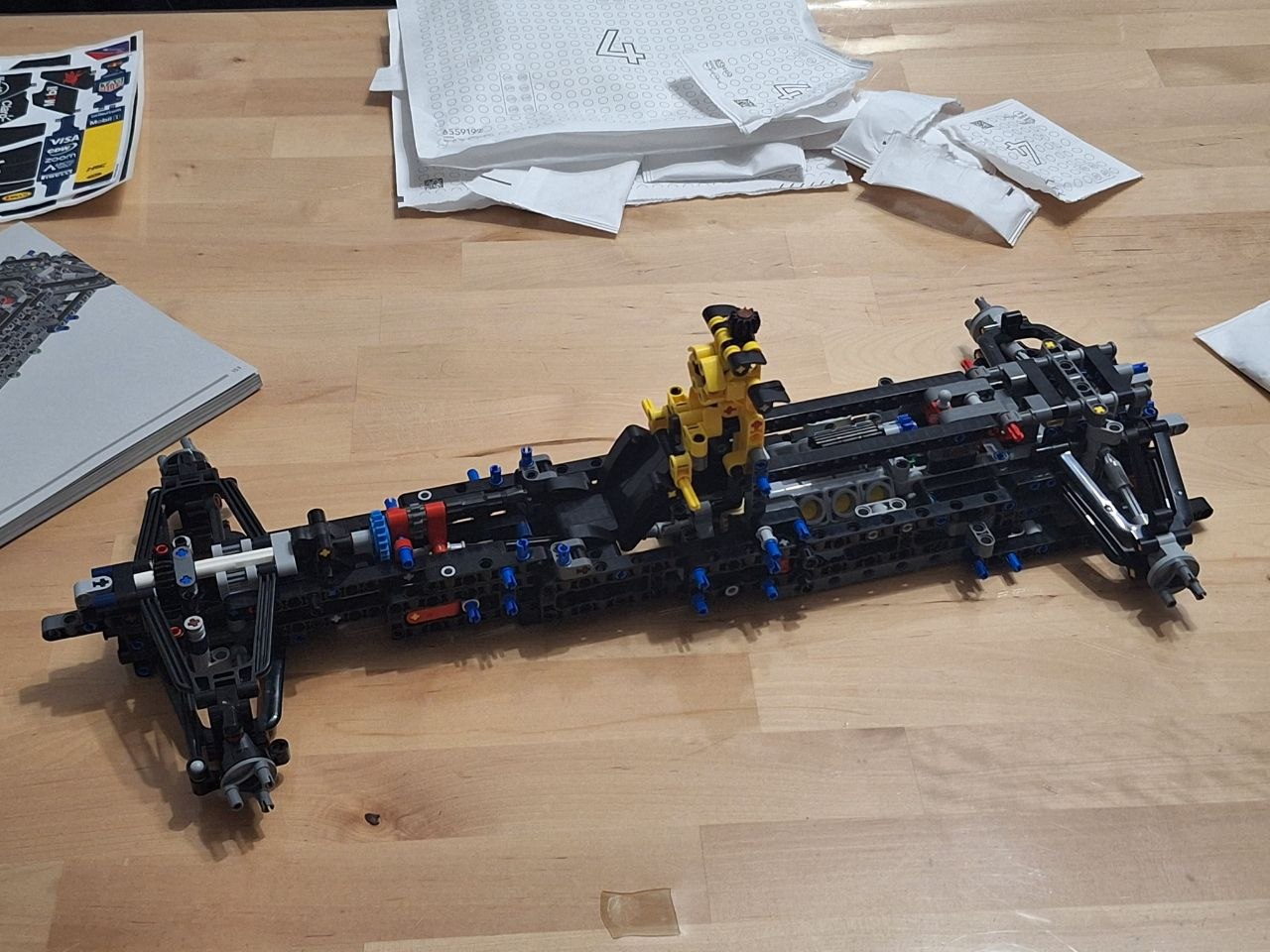 El montaje comienza con el chasis, que actúa como columna vertebral del modelo. Aquí se aprecia la robustez del diseño: vigas Technic que se entrelazan para formar una base rígida capaz de soportar el peso de la carrocería y los sistemas mecánicos. Esta primera fase nos pone en posición de estar construyendo la plataforma sobre la que se asentará todo el coche, similar a la estructura monocasco de fibra de carbono en un F1 real.