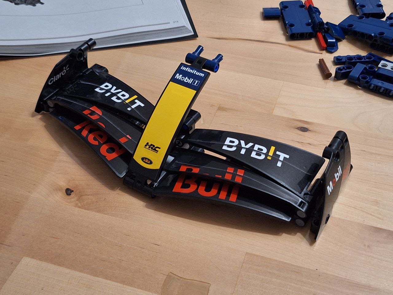 La fase final es la más visual. Se añaden los paneles que definen la silueta del RB20, incluyendo el alerón delantero, el halo y el alerón trasero. Aquí entran en juego los stickers oficiales de Red Bull Racing, que completan la identidad estética del coche. Aunque soy personalmente critico con la dependencia de pegatinas, lo cierto es que aportan fidelidad al diseño, con logos y colores que por otra parte desearía que vinieran impresos directamente en las piezas tanto por comodidad, simetría y facilidad de limpieza en el futuro.