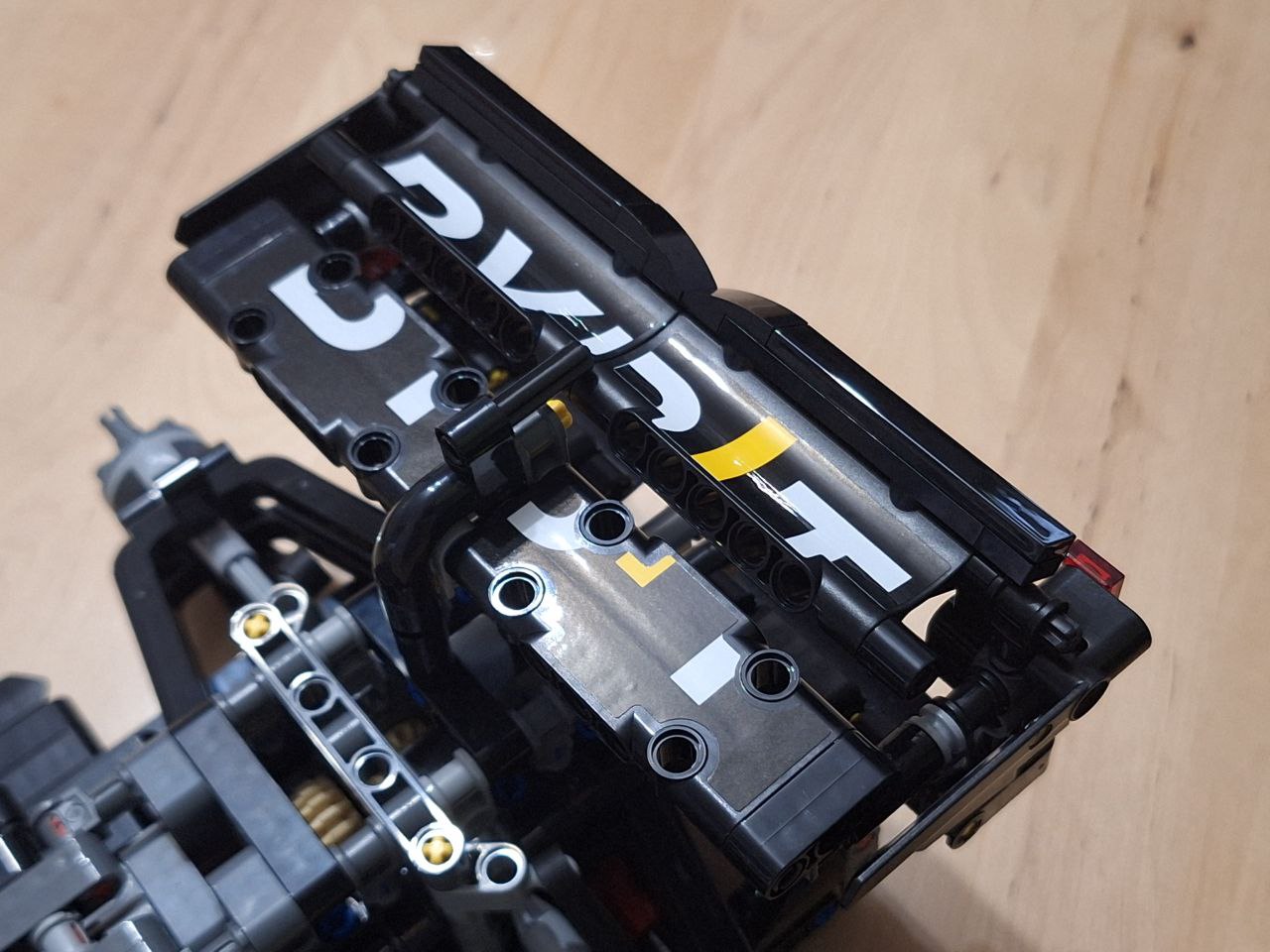 El corazón del set es el motor V6 híbrido. Aunque no reproduce la complejidad de un propulsor real de Fórmula 1, sí ofrece un mecanismo con pistones móviles que se accionan al girar las ruedas. Este detalle convierte la construcción en una lección práctica de mecánica básica: engranajes, transmisión de movimiento y sincronización.