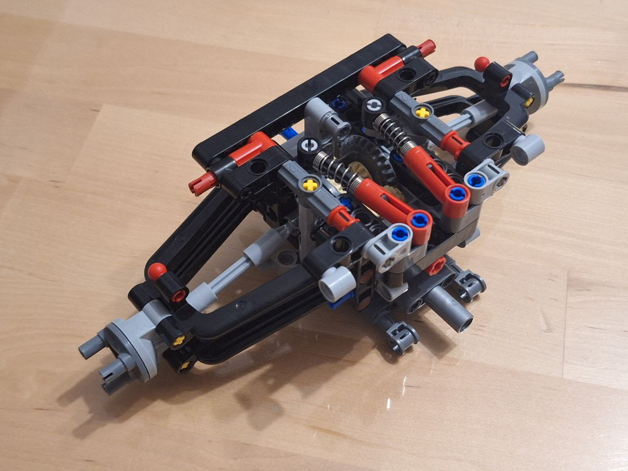 Una de las partes más gratificantes en mi opinión ha sido la suspensión, imitando al coche de referencia al usar el sistema push-rod en ambos ejes. El set incluye un sistema funcional que permite observar cómo trabajan los brazos de suspensión y los amortiguadores. Al presionar el coche contra una superficie, la respuesta de los muelles es inmediata, ofreciendo una experiencia táctil que conecta con la realidad de un monoplaza. La dirección, operada desde el volante, añade otro nivel de interacción. Aunque simplificada, permite girar las ruedas delanteras y comprobar cómo se transmite el movimiento a través de engranajes y ejes. También incluye un sistema alternativo de dirección en la parte superior del monoplaza, que también se camufla como parte del roll hoop.