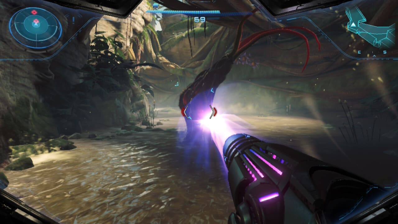 Aquí viene lo bueno. Cuando entras en cada una de esas cinco zonas y la moto se queda aparcada, Prime 4 recupera la esencia. La Espesura Iracunda es un bosque que respira. Hay ruinas Lamorn cubiertas de vegetación, hay plataformas a descubrir, hay puzles donde necesitas usar tu escáner para activar mecanismos ocultos. Los controles siguen siendo perfectos: apuntas, disparas, cambias de visor en fracción de segundo. A 60 FPS en modo Calidad se siente fluido, preciso, cómodo.