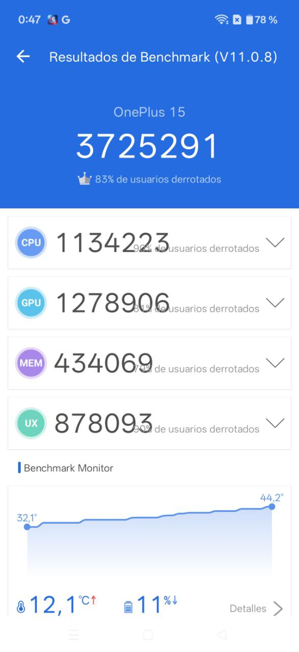 En pruebas con AnTuTu, el dispositivo mantiene temperaturas controladas gracias a un sistema de refrigeración mejorado. El thermal throttling aparece en pruebas de estrés, pero de forma muy moderada y sin afectar de manera crítica al rendimiento sostenido y razonable para el precio del dispositivo.