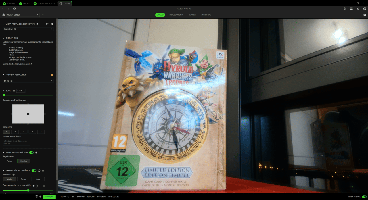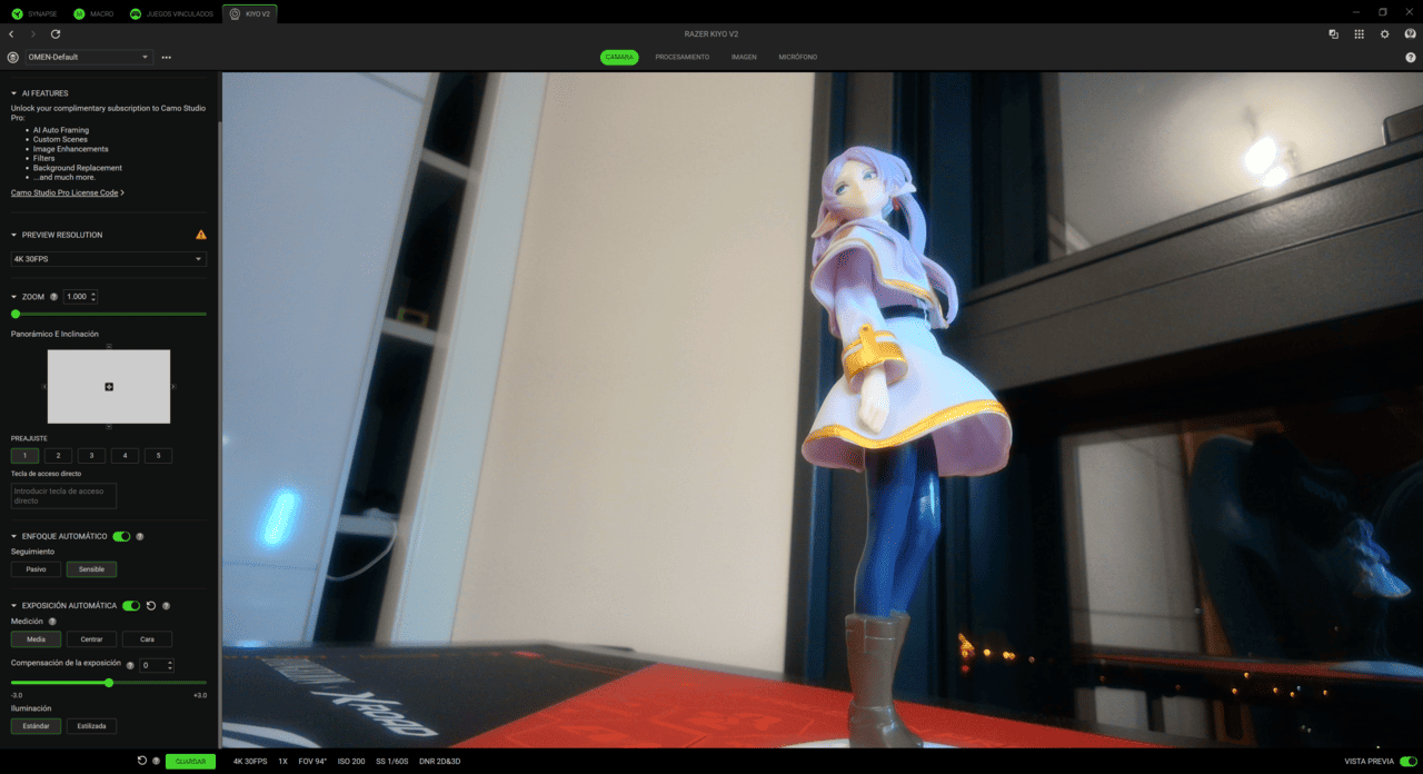 Razer Synapse es el núcleo de los dispositivos Razer, y como no podía ser de la Kiyo V2. He probado dos formas de usarla: modo automático y modo manual. En el modo automático, todo funciona de manera autónoma sin tu intervención: la cámara detecta si estás en un entorno oscuro, bajo luz LED, o con luz natural, y ajusta los parámetros automáticamente. Es útil cuando tienes prisas o simplemente quieres que la cámara «entienda» tu espacio.