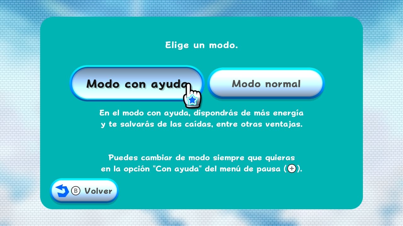 El modo ayuda aparece nada más comenzar el videojuego. Este modo duplica la vida de Mario y te devuelve automáticamente a la superficie si caes al vacío. Esto hace más accesible para jugadores casuales o para los más pequeños de la casa. Se puede activar y desactivar en cualquier momento, lo que es perfecto.