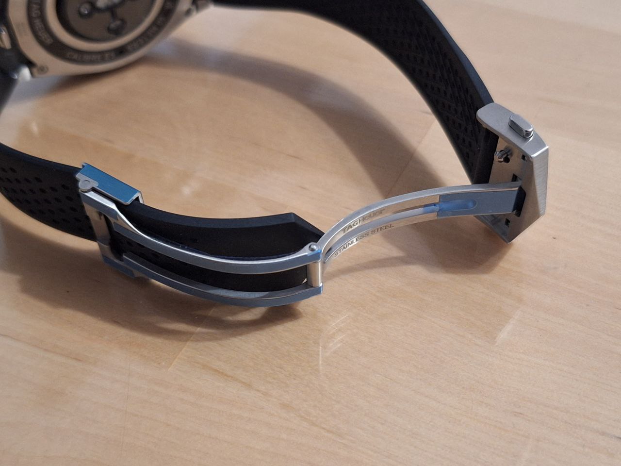 La correa de caucho perforado negra con cierre desplegable de acero refuerza el carácter deportivo del conjunto y asegura un ajuste cómodo y seguro. Es una configuración que se siente “reloj” antes que “gadget”: el peso, la distribución y el tacto de los materiales confirman que el objetivo ha sido preservar la experiencia objeto de lujo. La marca ha construido un smartwatch que, a nivel físico, está a la altura de su catálogo de cronógrafos.