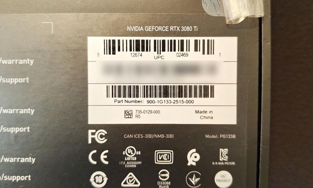 Según relata ChintzyPC, un conocido suyo logró adquirir dos unidades de RTX 3080 Ti 20 GB Engineering Sample por apenas 200$ (~168€) cada una, a través de un vendedor local. Lo sorprendente es que las tarjetas llegaron con embalaje aparentemente oficial, incluyendo etiquetas con códigos de modelo, números de serie y códigos de barras, un detalle poco habitual en este tipo de hardware previo al lanzamiento.
