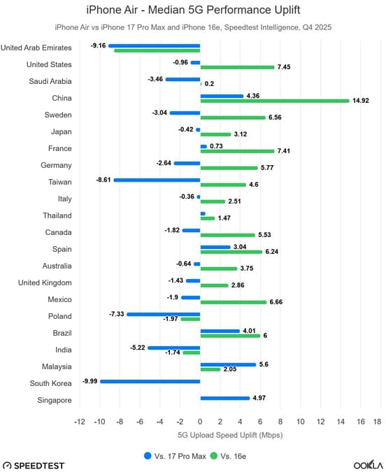 En mercados con redes muy saturadas o que dependen del DSS (Dynamic Spectrum Sharing) como Brasil, India o Malasia, el módem C1X no muestra mejoras sustanciales respecto al C1. Esto demuestra que el hardware de Apple está optimizado para redes 5G dedicadas y no para soluciones híbridas que «reciclan» el espectro del 4G. Es un aviso para navegantes: el C1X es un chip de futuro diseñado para exprimir infraestructuras modernas de 2026.