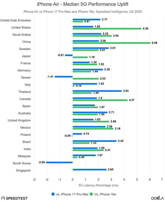 Aquí es donde el módem C1X brilla con luz propia frente a la solución de Qualcomm. Según los datos de Ookla, el chip de Apple ofrece una latencia significativamente menor en mercados clave como China y EE. UU., con una ventaja de hasta 6 ms. Este parámetro es crítico en 2026 para el uso de IA generativa en tiempo real y servicios de cloud computing, donde la capacidad de respuesta es más importante que la descarga bruta de datos.