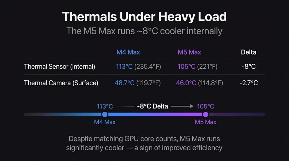 Los resultados obtenidos durante las pruebas muestran una reducción moderada en las temperaturas del M5 Max frente a su predecesor: