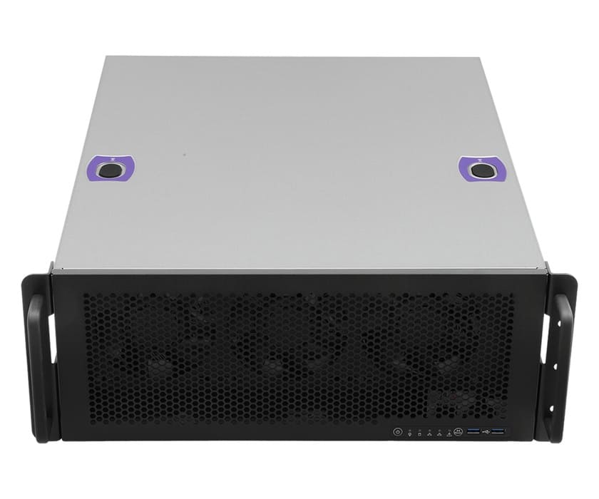 El chasis 4U aloja ocho RDIMM ECC DDR5 a 6.400 MT/s en configuración octa-channel (1 DPC), lo que permite escalar hasta 2 TB de RAM. La alimentación corre a cargo de una fuente ATX 3.1 de 2.500W 80 Plus Platinum, asegurando margen suficiente para las cuatro GPUs de 300W cada una junto con el resto de componentes.