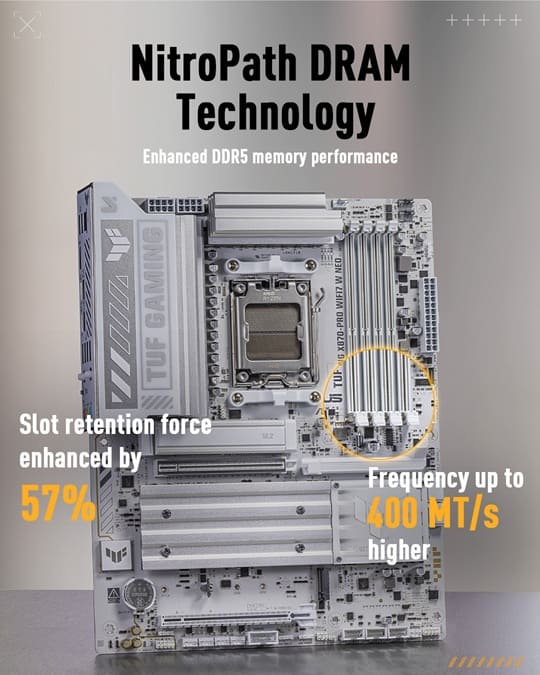 Especial mención merece la TUF Gaming X870-PRO NEO, ya que introduce NitroPath DRAM en un segmento tradicionalmente más equilibrado en precio, sin renunciar a mejoras tangibles en DDR5, algo poco habitual hasta ahora fuera de la gama ROG.