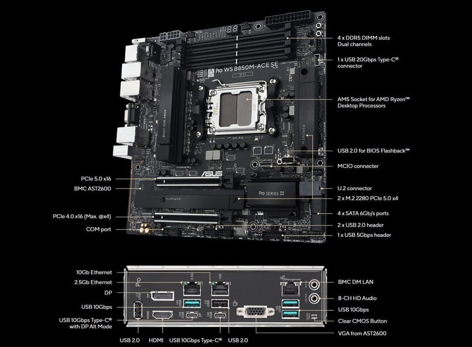 El planteamiento es poco habitual en el segmento de consumo: una placa compacta, pero con gestión remota, memoria ECC, múltiples interfaces de red y soporte para una gama muy amplia de procesadores AM5, incluyendo CPUs de clase servidor.