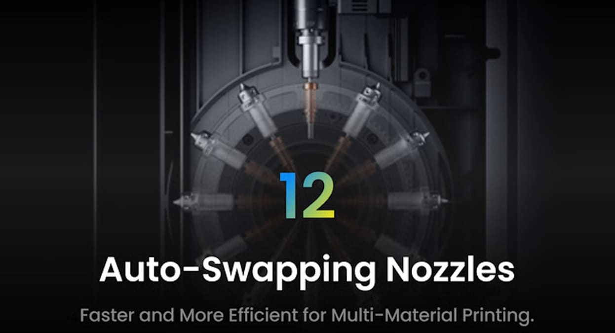 El elemento más llamativo del sistema es su mecanismo tipo revólver con 12 boquillas intercambiables, diseñado para automatizar el cambio de material durante la impresión. Frente a los sistemas tradicionales basados en cortes y recargas de filamento, este enfoque pretende optimizar tanto el tiempo de cambio como el uso de material, dos de los principales cuellos de botella en la impresión multicolor.