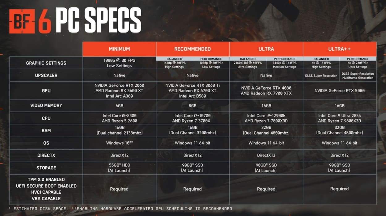 El perfil oficial de Battlefield en X (Twitter) compartió los requisitos definitivos para PC, incluyendo las configuraciones Mínima, Recomendada, Ultra y Ultra++. Mientras las dos primeras no han cambiado respecto a las pruebas beta, las dos últimas elevan considerablemente las exigencias.