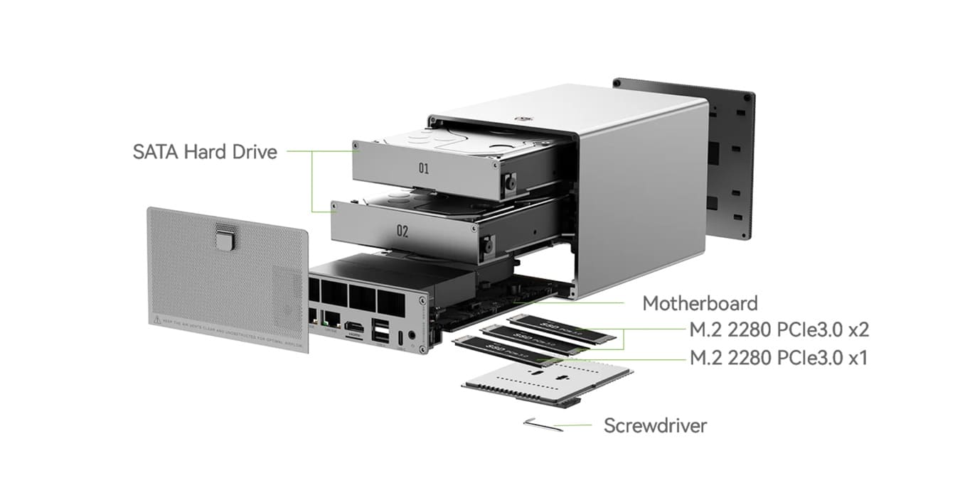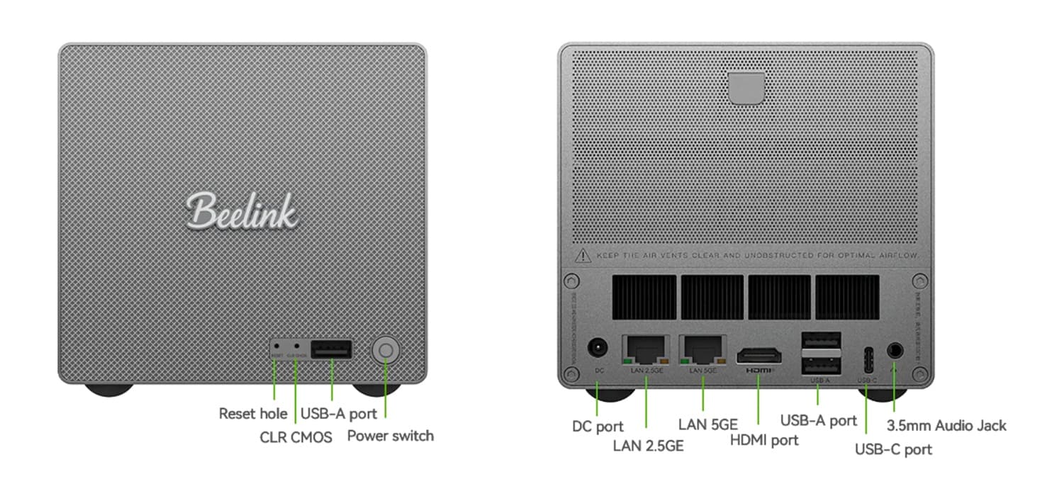 Además, Beelink ha incorporado dos bahías de 3,5 pulgadas, lo que permite elevar la capacidad total hasta 72 TB en un chasis extremadamente compacto de 166 × 121 × 112 mm. Este formato resulta especialmente atractivo para laboratorios domésticos, oficinas pequeñas o despliegues edge.